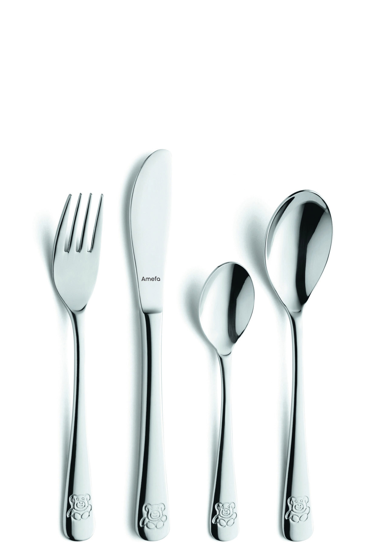 Amefa Teddy Bear Das Kinderbesteck Teddy Bear der Marke Amefa richtet sich an alle kleinen Gäste. Ein am Griffende geprägter Bär begleitet die Minis durch das Menü und sorgt auch bei den Erwachsenen für gute Laune. Besondere Merkmale:› hochglänzend› poliert› rostfrei› 2,5 mm Materialstärke