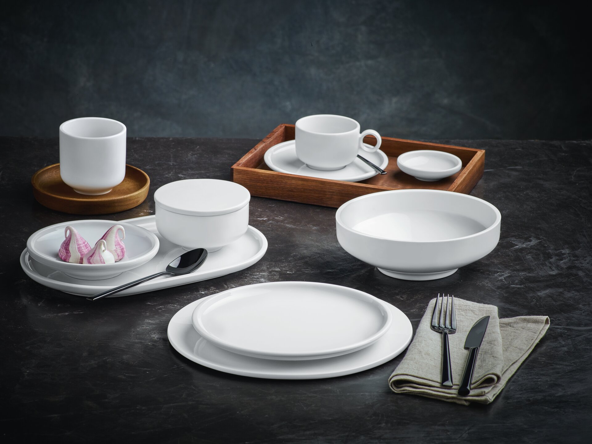 Geradlinigkeit, Purismus und Einzigartig � das neue Sortiment Shiro von Sch�nwald greift den Design-Trend �Japanordic� auf, der zwischen japanischer und skandinavischer Kultur vermittelt. Shiro gibt dem Trend zu nordischem Understatement ein attraktives Setting. Das l�ssige Geschirr macht in der rustikalen Bar eine genauso gute Figur wie im Nobelrestaurant. Seinen kraftvollen Charakter verdankt es der fl�chig breiten Bordgestaltung. Die variable S-Form der Seitenkontur bringt eine feine Spannung in das Design ein.