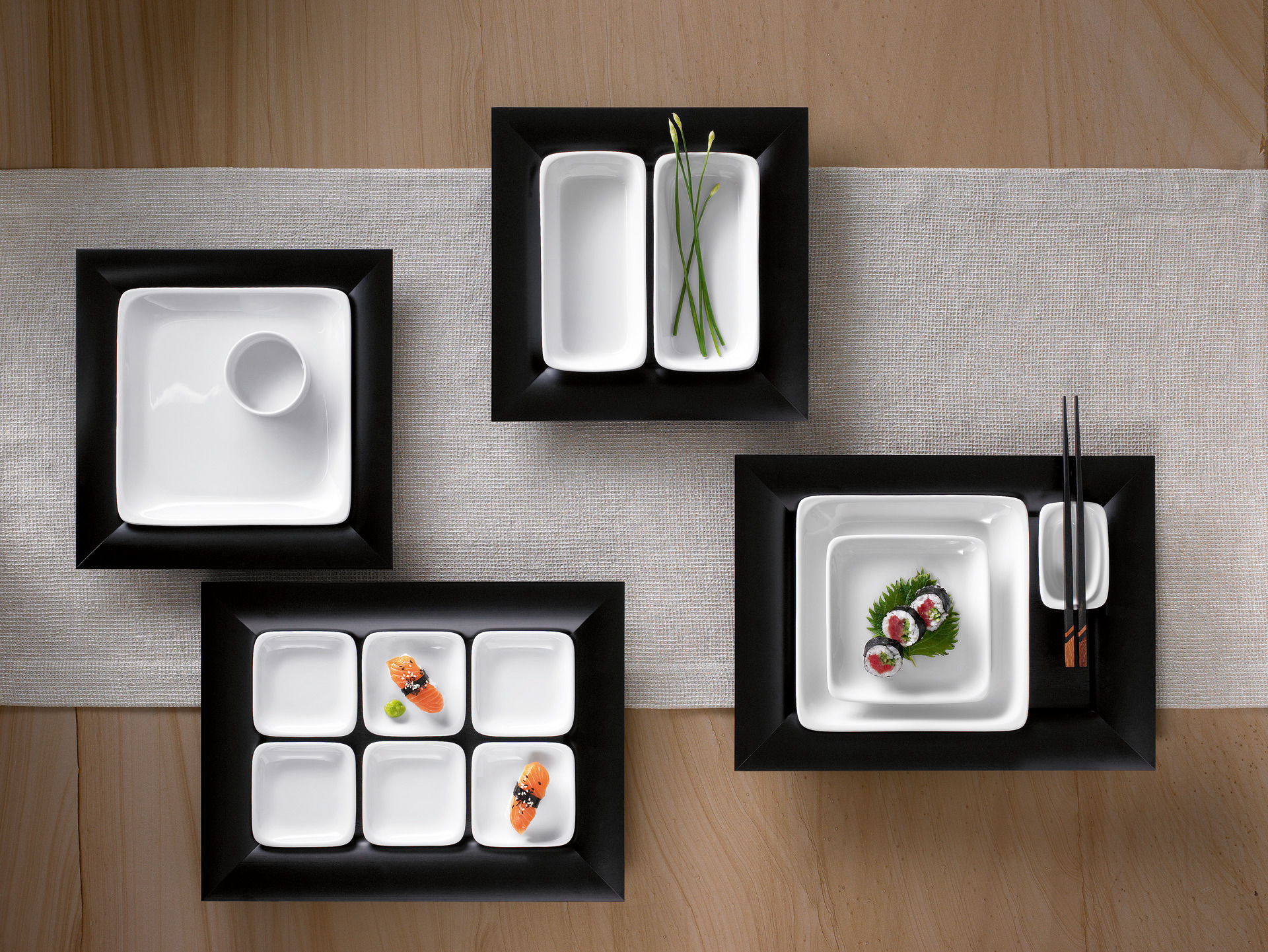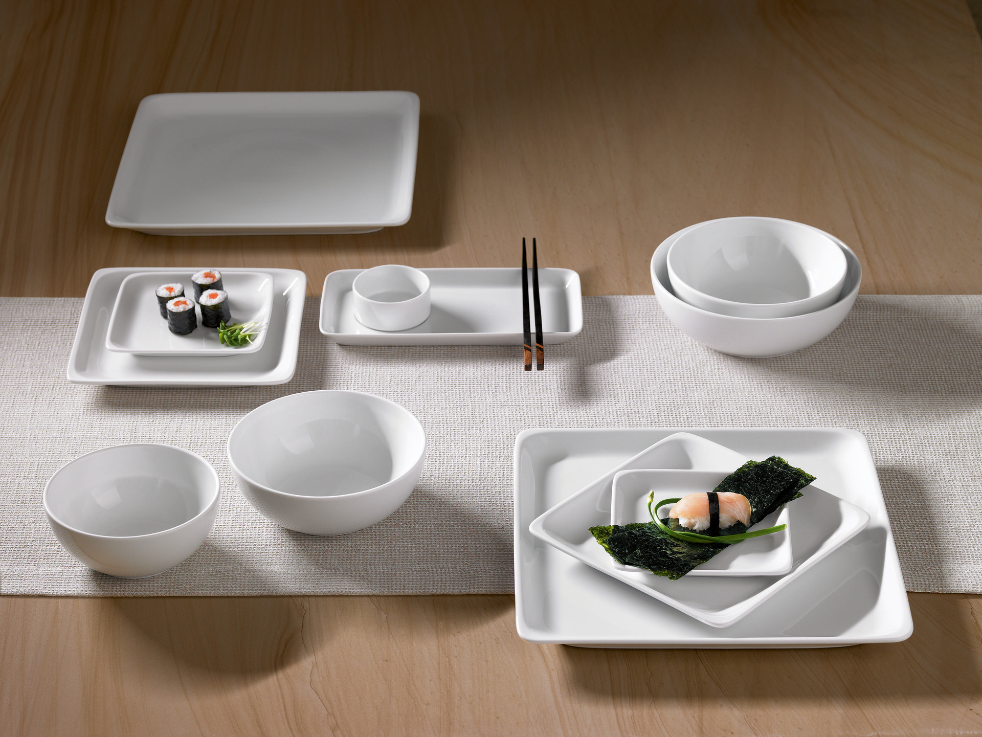 Bauscher Modulus Modulus, das sind Flachteile und Schalen, mit denen in der trendbewussten Gastronomie unterschiedlichste Speisen, insbesondere aber Fingerfood, asiatische Spezialitäten oder Mediterranes, pur und ästhetisch serviert werden können. Showboards aus heller Buche oder gebeizter Wenge ergänzen das hochwertige Porzellan und bilden einen kreativen Kontrast zwischen Material und gestalterischer Formensprache.