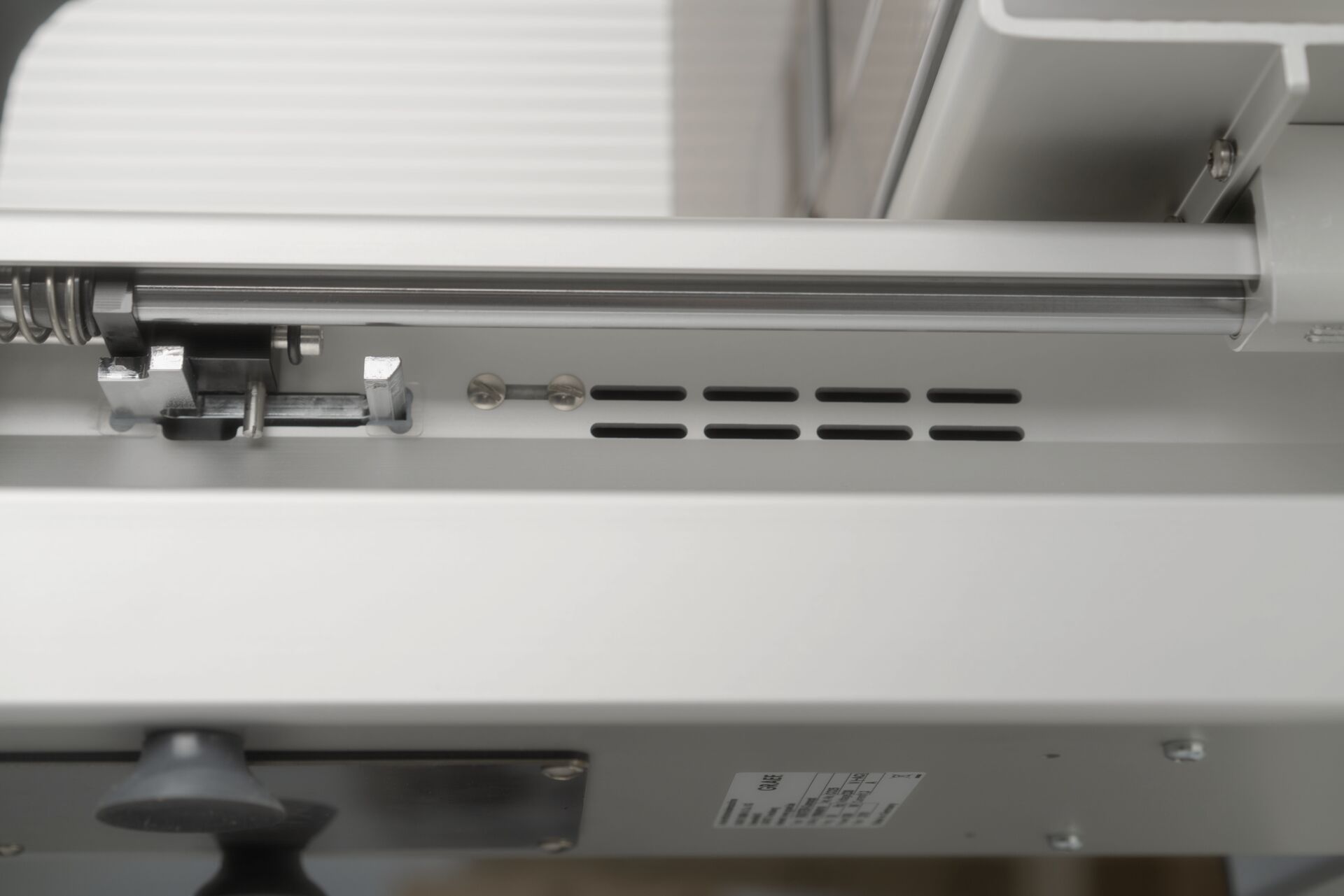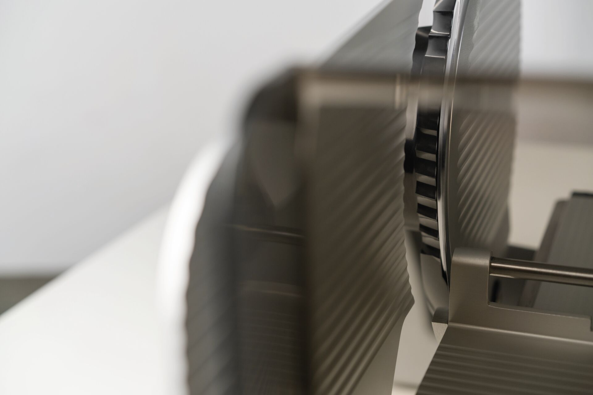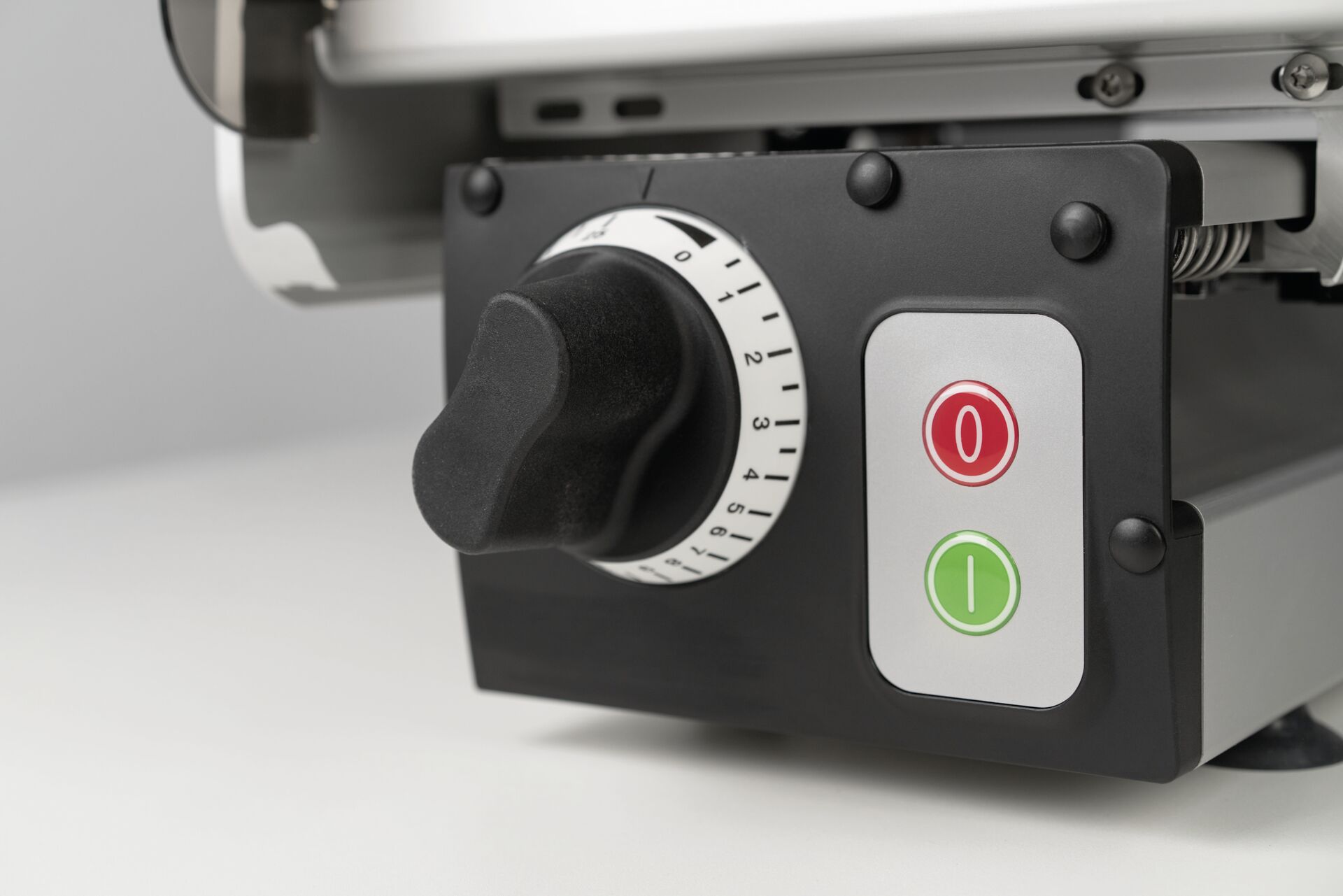 Maße in cm: 47,0x35,0x37,6Leistung in W: 300Für Wurst, Fleisch, Käse, Brot, Gemüse und ObstGeradeschneider. Material: Alu-Eloxal. Anschluss: 230V. Schneidscheibe &OSlash; 250 mm cera3 Beschichtung, dadurch auch für Schneidgüter wie Wurst, Fleisch, Käse, Brot, Gemüse und Obst geeignet. Max. Schneidkapazität bei geringer Aufstellfläche, L-Bauform erlaubt die Kombination mit Tabletts, Schneidbretter, Waagen, etc., geschlossene, leicht abnehmbare Messerabdeckplatteund Messerabstreifer, Messer u. Flächen von allen Seiten frei zugänglich, Schlitten um 90° abklappbar, Betriebsdauer: Dauerlauf, Emissions-Geräuschpegel: <69 dBA, Messerdrehzahl: 199 U/min., Schnittstärke 0-20 mm, Schnittgröße ( LxB ): 23,0x17,0 cm, Schlittenbreite: 25,0 cm, Außenmaße ( LxBxH ): 47,0x35,0x37,6 cm, Aufstellfläche ( LxB ): 47,0x31,5 cm, Zubehör: 2-Stufen Messerschärfer ( nurglatte Messer ), Spezialöl.