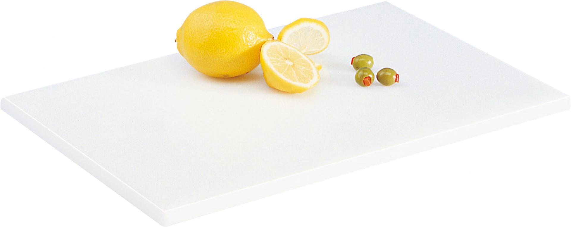 Farbe: weißLxB in cm: 38x25PE 500, ohne Saftrille, mit Antirutsch-Füßchen. Stärke 1,2 cm. Bis 80°C temperaturbeständig. Schneidbretter dürfen beim Spülvorgang nicht geklemmt werden. Keine heißen Gefäße aufstellen, kann zum Verzug der Platten führen.Farbe: weißLxB in cm: 38x25Stärke in cm: 1,2