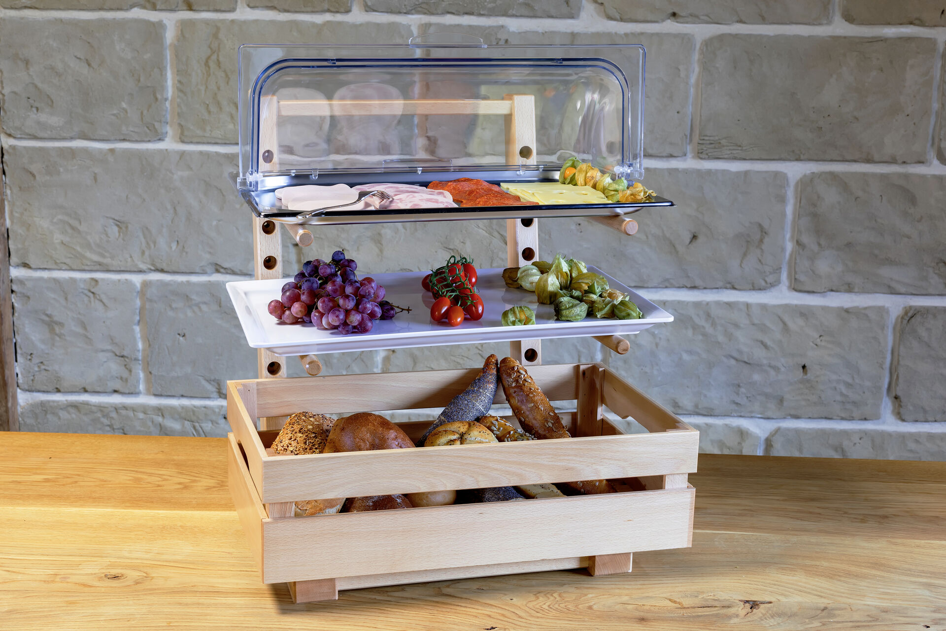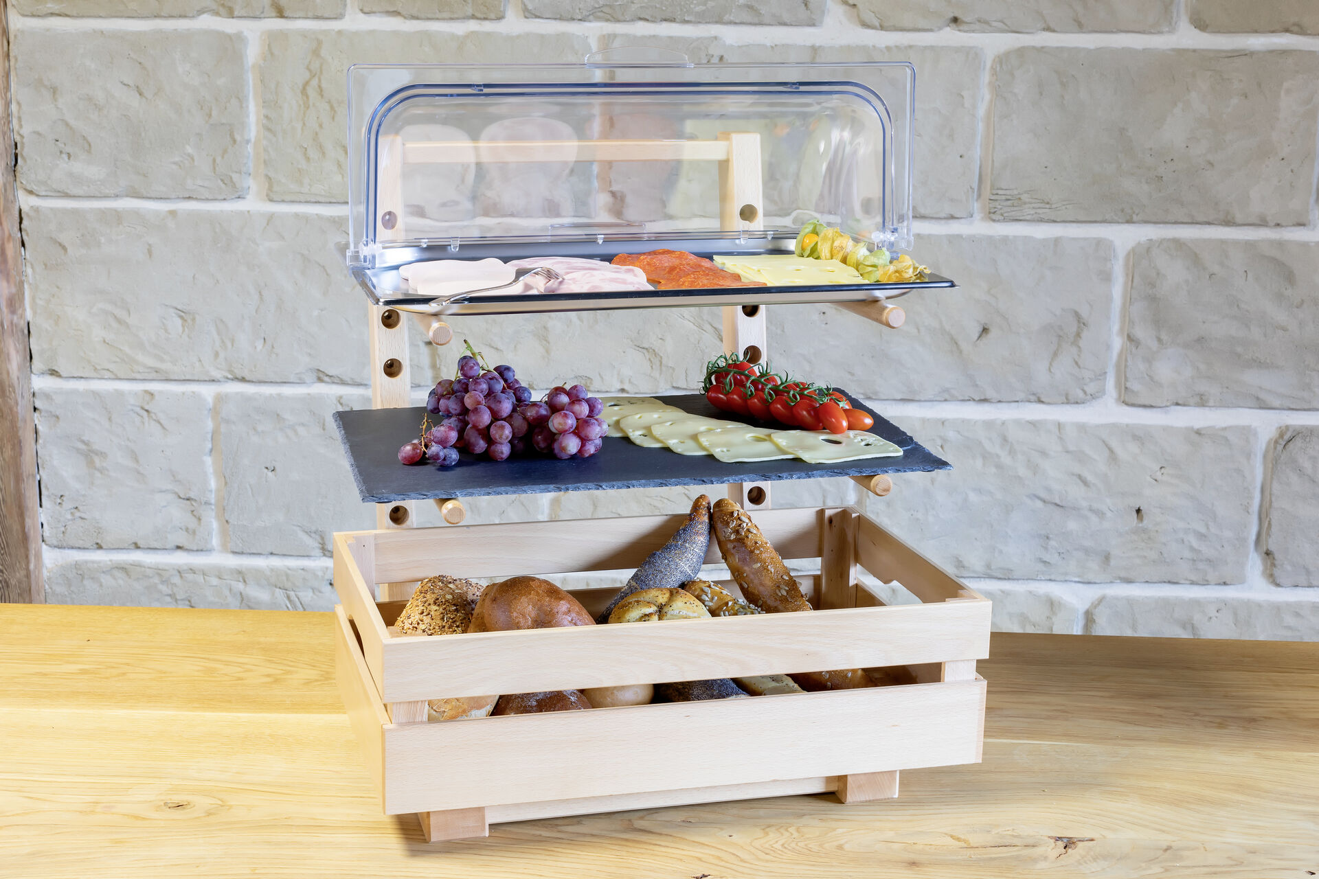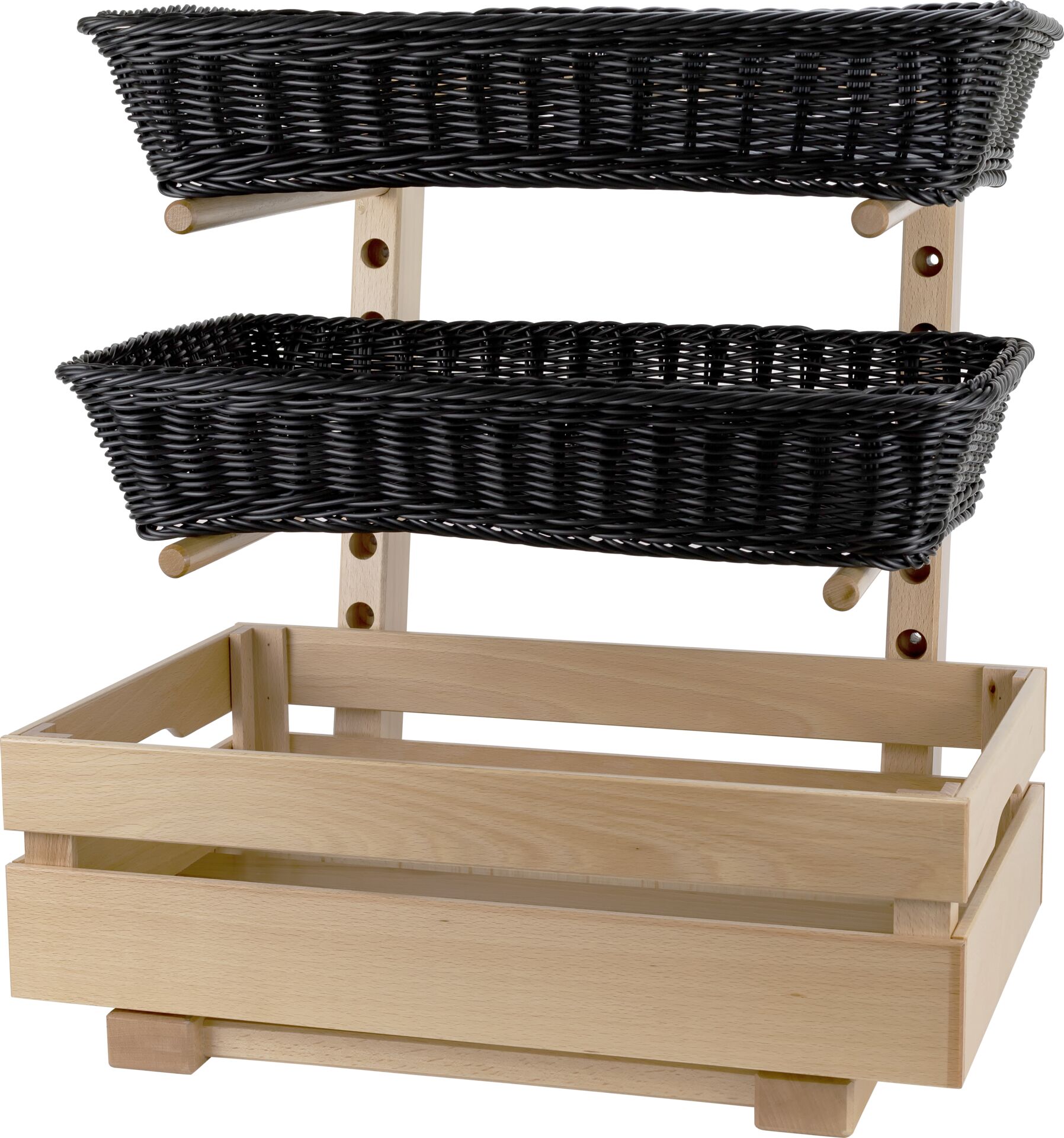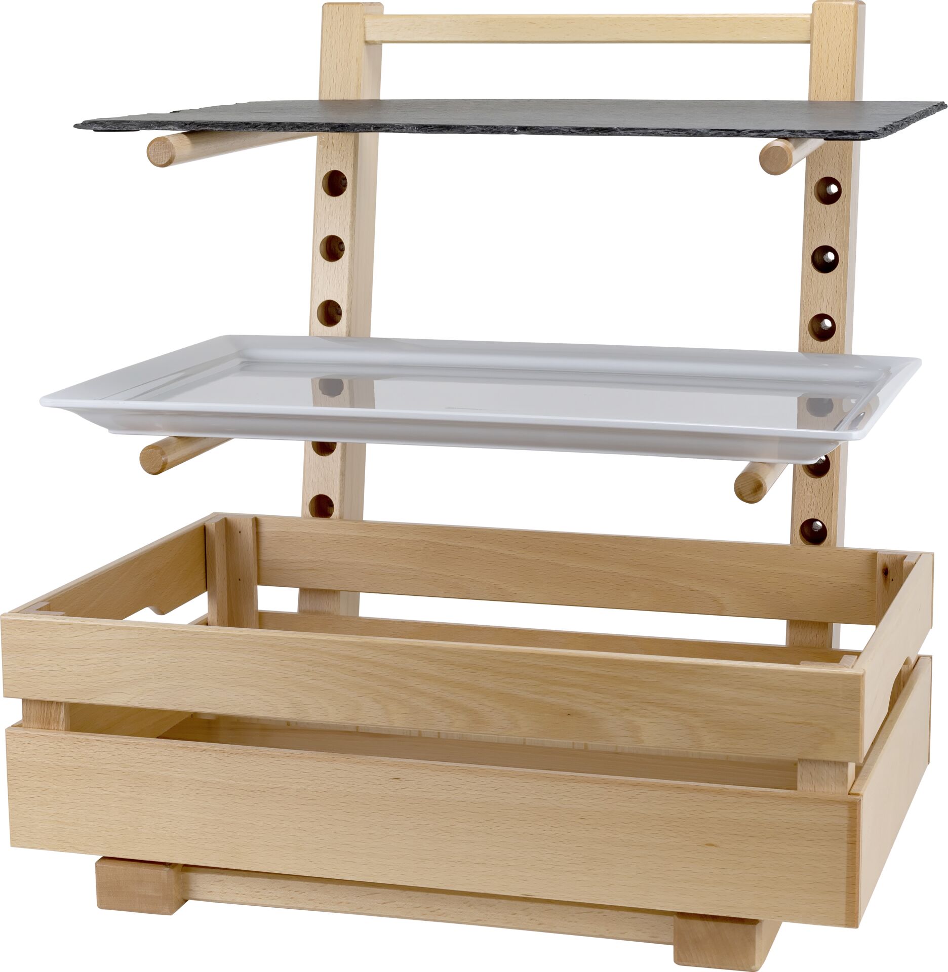 Buffetständer aus Buchenholz. Lebensmittelecht versiegelt, um Verschmutzung zu verhindern und eine bessere Reinigung zu gewährleisten. Nicht spülmaschinengeeignet! Lieferumfang: Ständer, vier Rundhölzer und Befestigungschrauben. LxBxH: 43,5x46x58cm. Maße der Stäbe: &OSlash; 1,8cm, Länge 38cm. Hierzu passende Holzbox (Art.: 15256) separat erhältlich.