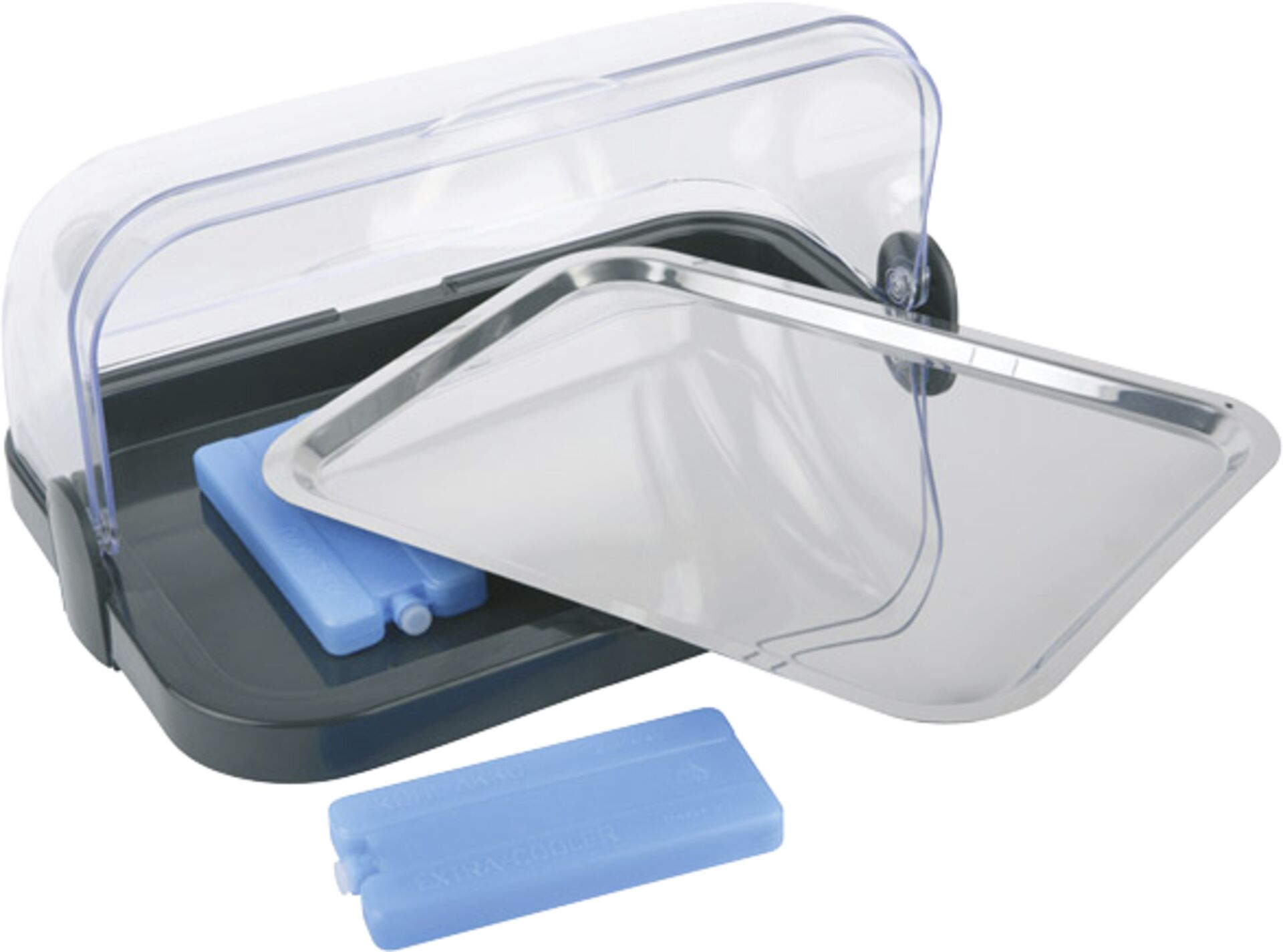 Made in GermanyTransparente Rolltophauben (SAN Kunststoff) sind beidseitig aufklappbar und schützen ihre Speisen, Schale (ABS Kunststoff), Tablett 39x28 cm(Edelstahl 18/0), Kühl-Akkus (halten ihre Speisen bis zu 6 Stunden kühl). Buffet-Vitrine ist zerlegbar, daher platzsparende Aufbewahrung. Leicht zu reinigen, da alle Einzelteile (bis auf die Akkus) spülmaschinengeeignet sind. Farbe: schwarz.BxTxH in cm: 44,0x32,0x44,0Ausführung: doppeltInhalt: 2 Hauben, 2Schalen, 2 Tabletts, 4 Akkus