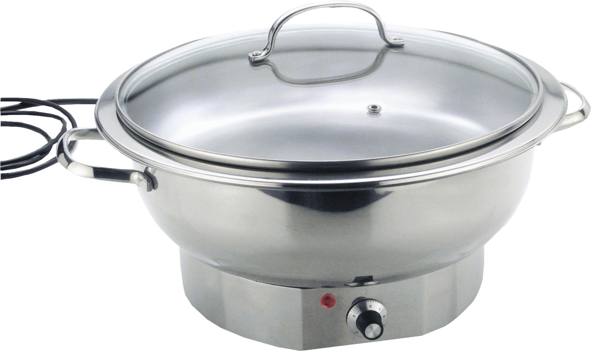 &OSlash;xH in cm: 30,0x16,0Anschlusswert: 230V/420W/50-60HzWEEE-Reg. Nr. WE 61118672Edelstahl 18/10, rund, mit Glasdeckel, elektrisches Thermostat mit Überhitzungsschutz. Mit Speiseeinsatz (3,8 Liter).