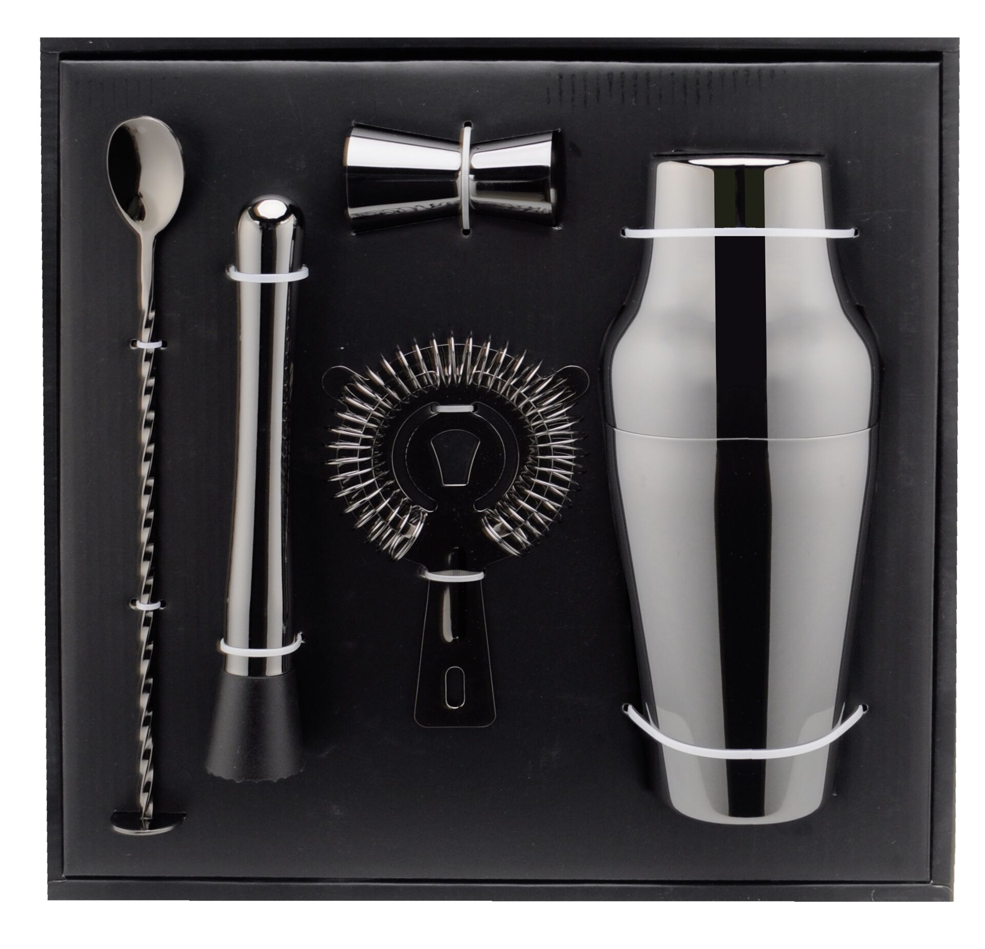 Set bestehend aus: 1x Shaker mit Deckel 600ml, 1x Cocktailmaß 30ml/20ml, 1x Cocktailsieb, 1x Stößel, 1x Barlöffel. Lieferung in Geschenkkarton. Spülmaschinengeeignet.
