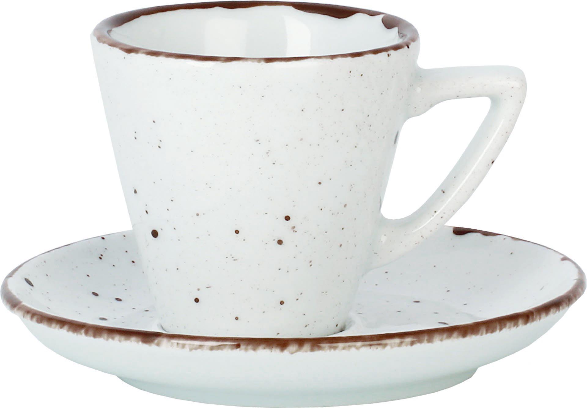 Porzellan. Grundfarbe weiß, Rand braun und Spiegel braun gesprenkelt. Mischsortierung. Spülmaschinengeeignet.Ausführung: Tasse obere EspressoMaße/Inhalt: 0,08 LFarbe: weiß