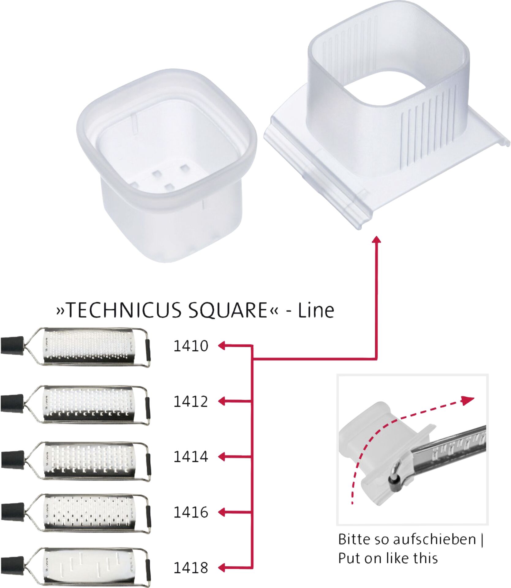 PP, schützt die Finger und ermöglicht ein gefahrloses Reiben auch von sehr kleinen Stücken, spülmaschinengeeignet.LxBxH in cm: 6,9x6,7x4,5Passend zu Reiben: Art. 13701, 702, 703, 704 u. 705
