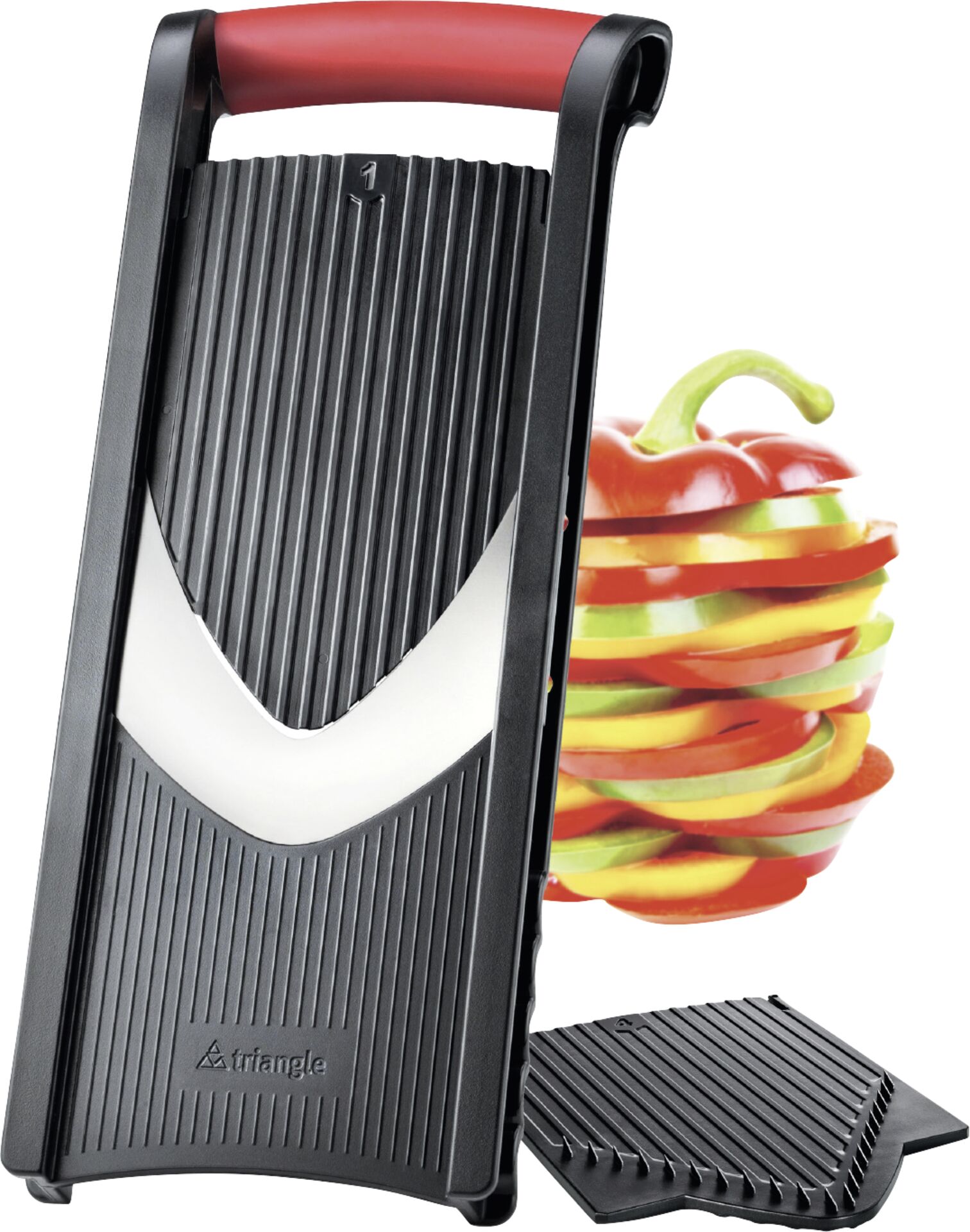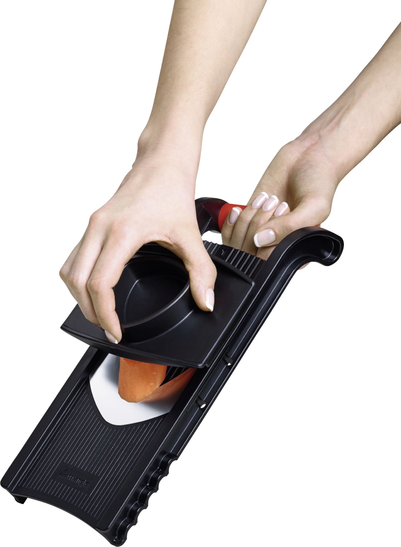 LxBxH in cm : 31x11x5,5Patentierte Parabelklinge (superscharfe Klinge für perfekten, leichten Schnitt)Edelstahlmesser und Kunststoffgehäuse. 2 wendbare Einsätze für 3 verschiedene Dicken & Julienne. Klingenschutz. Restehalter. Spülmaschinengeeignet.