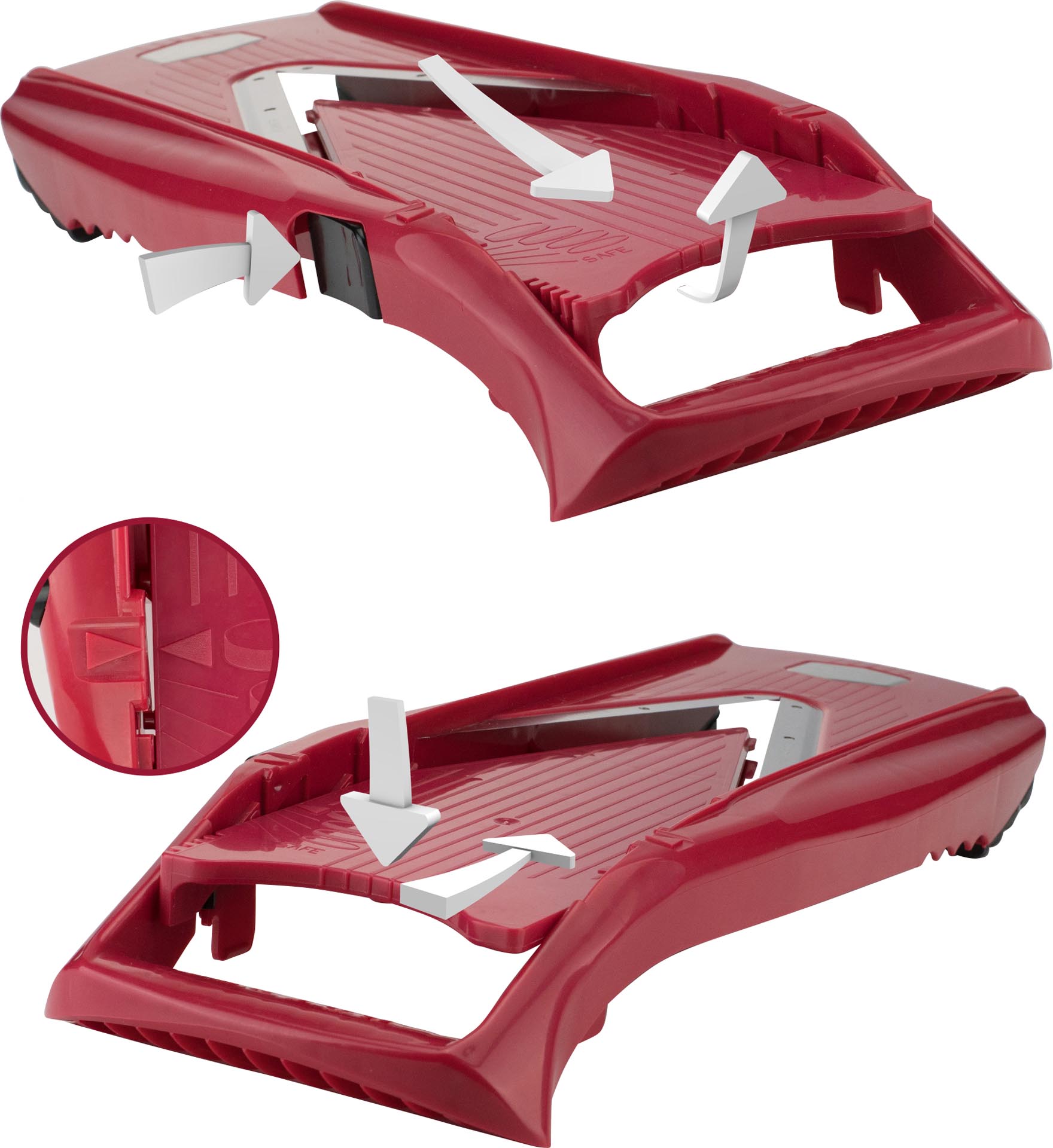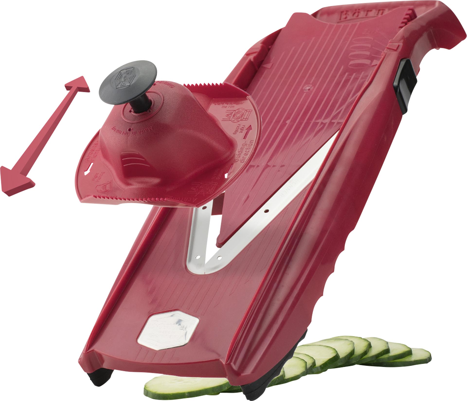 LxB in cm : 38x14,5ABS, Klinge Edelstahl. Ergonomischer Griff. Knopf für Schnitthöheneinstellung. Sicherheitsposition für zusätzlichen Schutz. Rutschfeste Gummifüße. Inklusive 3,5mm und 7mm Einschub, Sicherheitsfruchthalter. Schnittstärken von 1,2mm bis 7mm möglich. Verschiedene Möglicheiten, Scheiben, Würfel, Stifte.