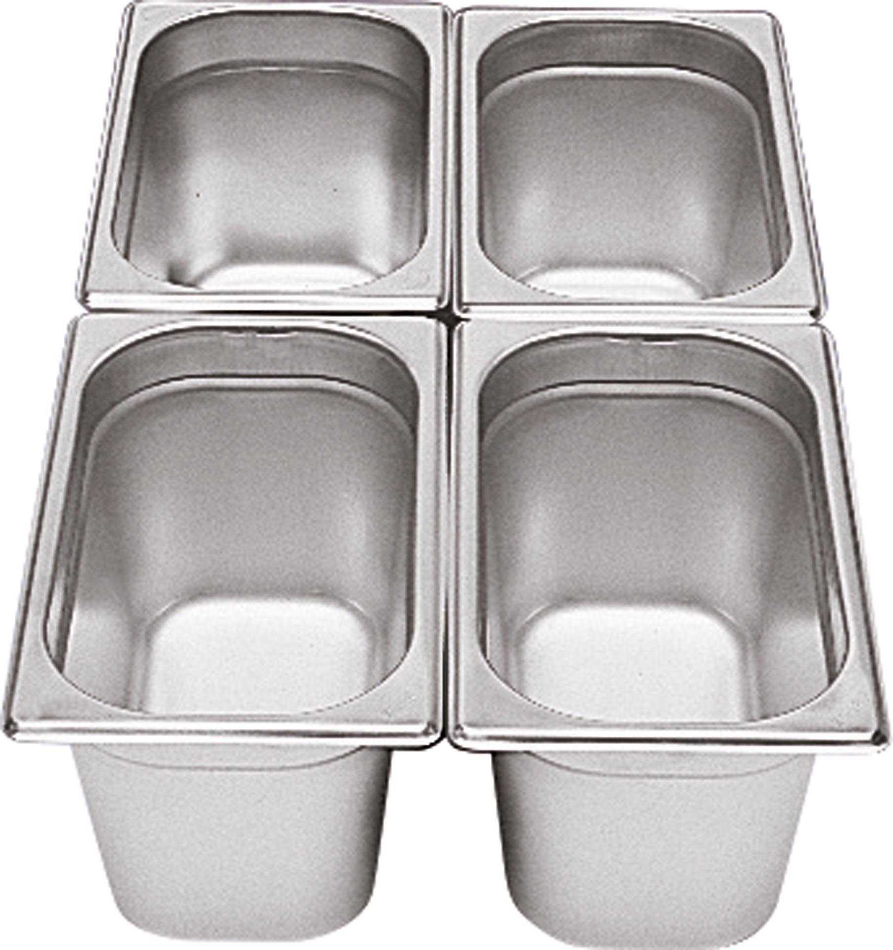 GN-Norm: 1/4Tiefe(mm): 65Inhalt (Liter): 1,8Chrom-Nickel-Stahl 18/8, rostfrei.GN-Norm: 1/4Tiefe(mm): 100Inhalt (Liter): 2,7