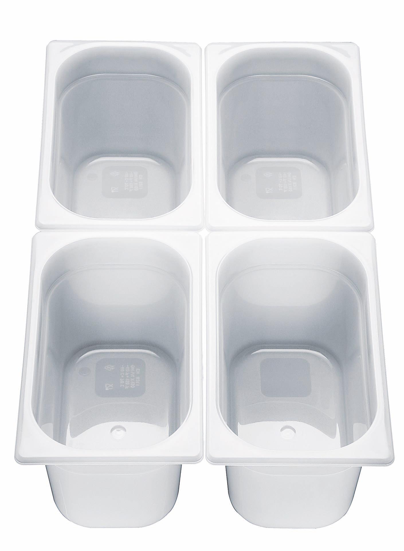 GN: 1/4Tiefe (mm): 100Inhalt (Liter): 3,2Polypropylen, einsetzbar von -40°C bis +70°C, spülmaschinen- und mikrowellengeeignet.GNxT mm: 1/4Tiefe (mm): 150Inhalt (Liter): 3,7Polypropylen, einsetzbar von -40°C bis +70°C, spülmaschinen- und mikrowellengeeignet.