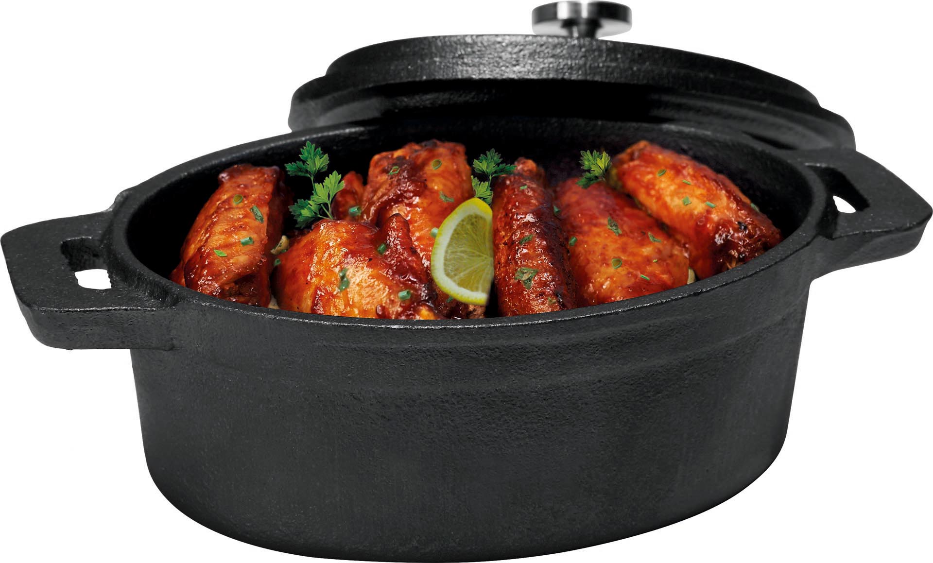 Pfännchen und Töpfchen zum ServierenGusseisen. Nicht spülmaschinengeeignet.Ausführung: oval mit Deckel und zwei KurzgriffenLxB in cm: 12,0x9,0