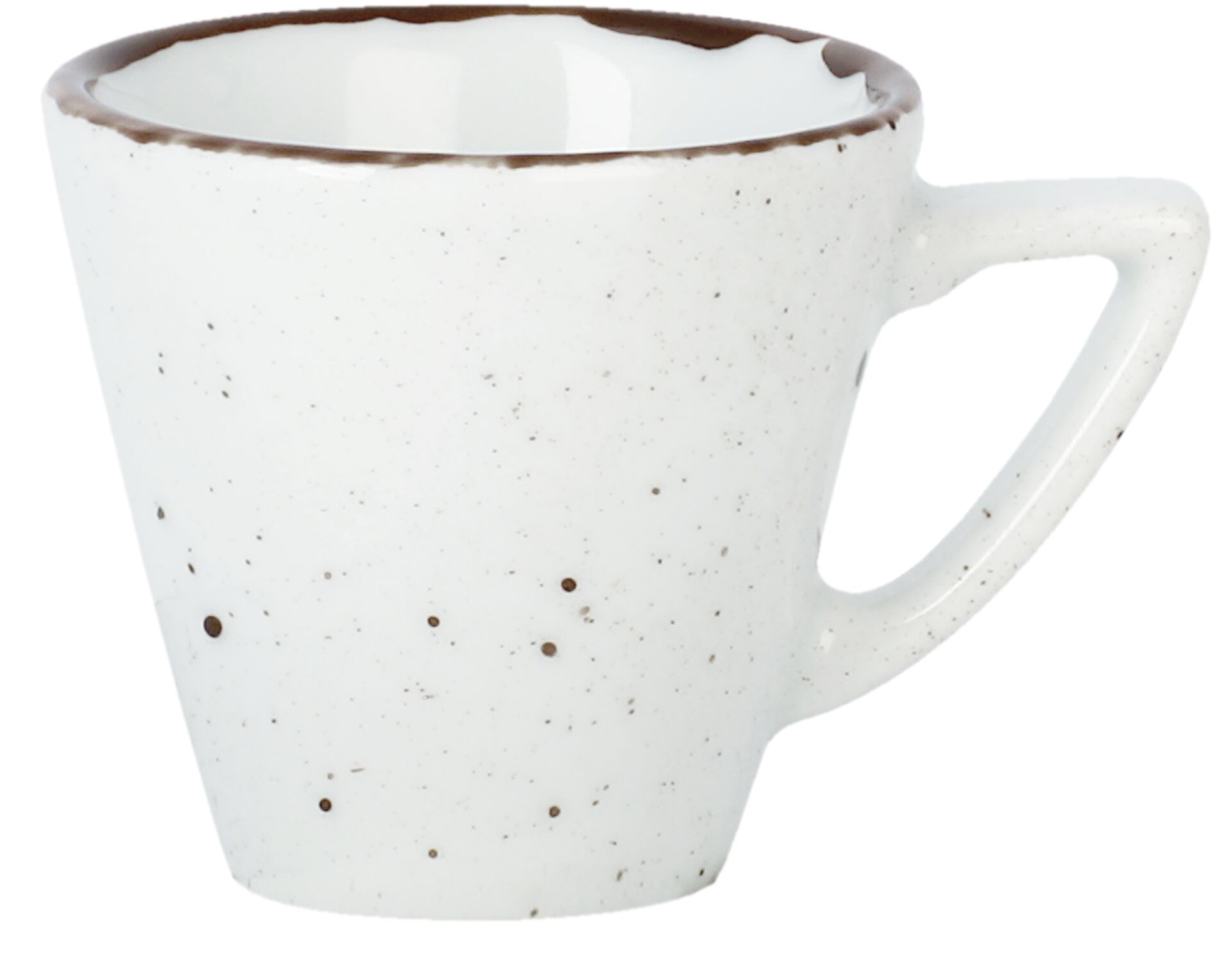 Porzellan. Grundfarbe weiß, Rand braun und Spiegel braun gesprenkelt. Mischsortierung. Spülmaschinengeeignet.Ausführung: Tasse obere KaffeeMaße/Inhalt: 0,21 LFarbe: weiß