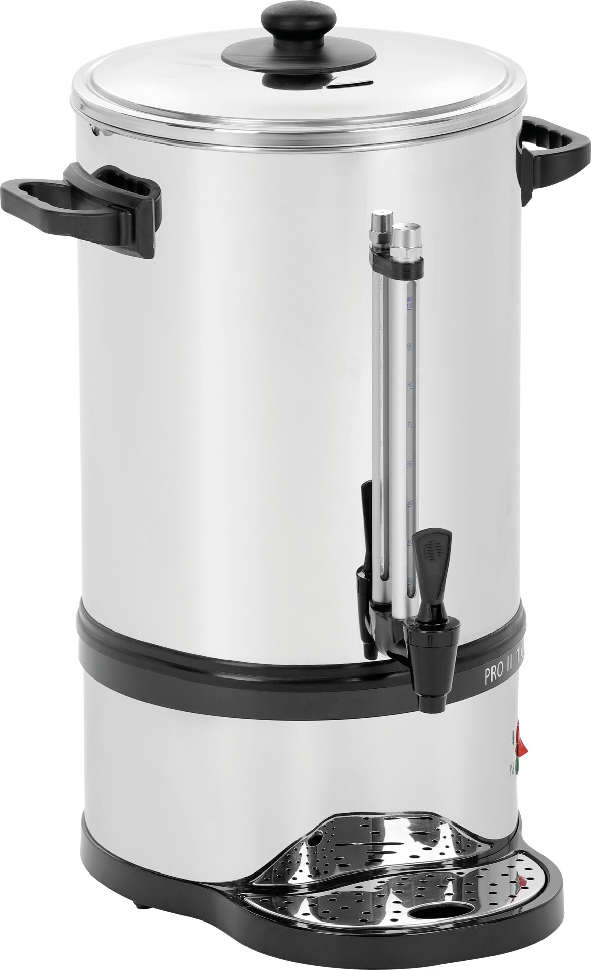 Mit Warmhaltefunktion. Mit Entkalkungssignal. Füllstandsanzeige. Filter Edelstahl. Heizsystem Edelstahl. 50/60Hz. Kontrollleuchte. Ein-/Ausschalter. 2 Getrennte Heizsysteme für Brüh-und Warmhaltefunktion. Kaffeemaschine kann auch OHNE Filterpapier genutzt werden. Inkl. Reinigungsschaber. Material Edelstahl/Kunststoff.Inhalt in L: 13,2BxTxH in cm: 35x37,1x57,5Anschlusswert: 230 V/1,6 kWInhalt 13,2 Liter, ca. 90 - 100 Tassen, Aufbrühzeit ca. 55 Minuten.Brühzeit für 13,2 L ca. 55 Min. Mind.-Aufbrühmenge 6 L (ca.40 Tassen). Max. Leistung 90-100 Tassen. 50/60Hz.