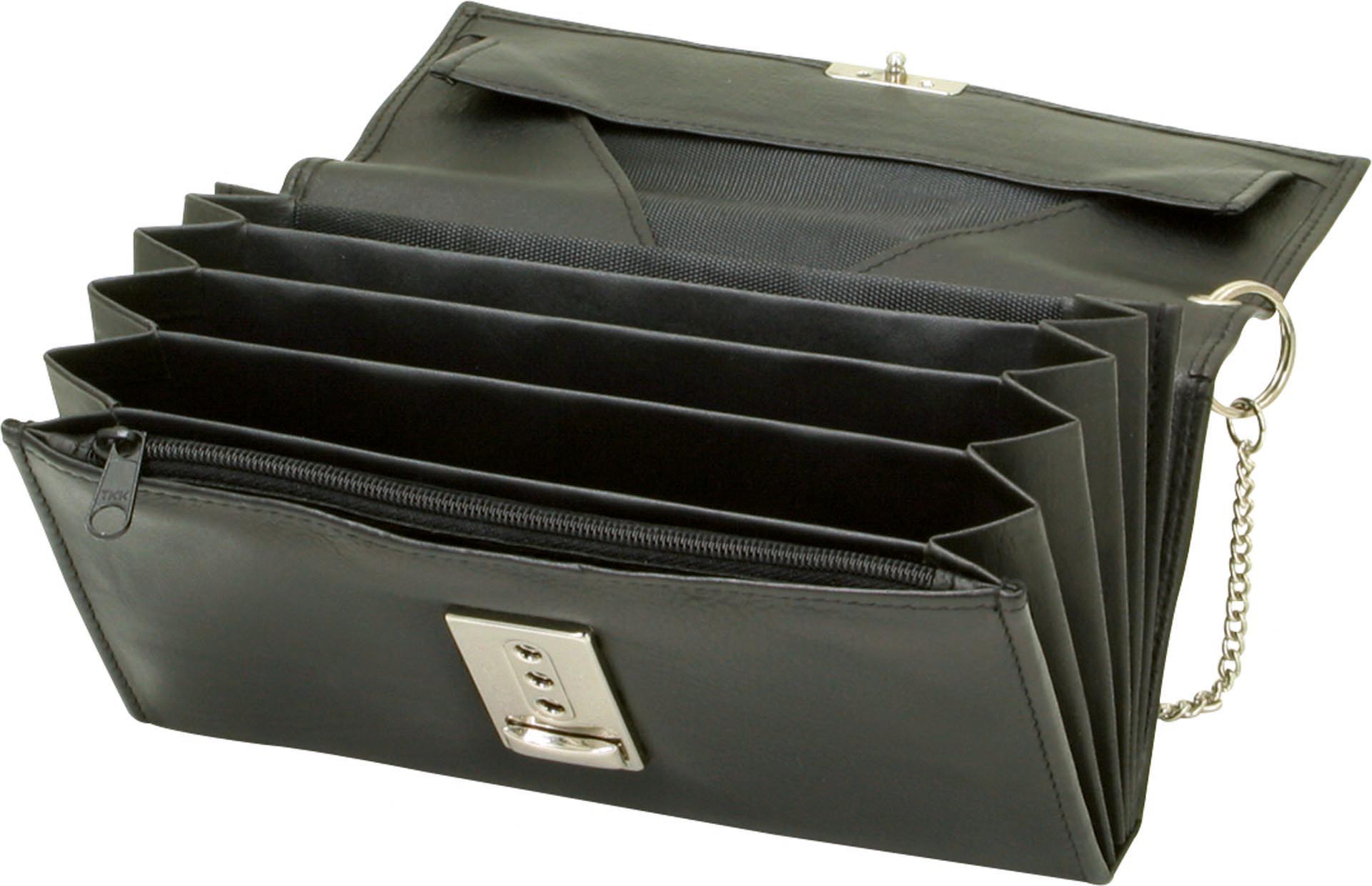 BxH in cm: 17x10Nappa-Leder schwarz. Schlüsselkette mit Karabinerhaken. Bestehend aus: 1x Münzfach, 5x Scheinfach, 1x schmales Scheinfach, 1x Reißverschlussfach, 1x Steckfach an der Rückseite.