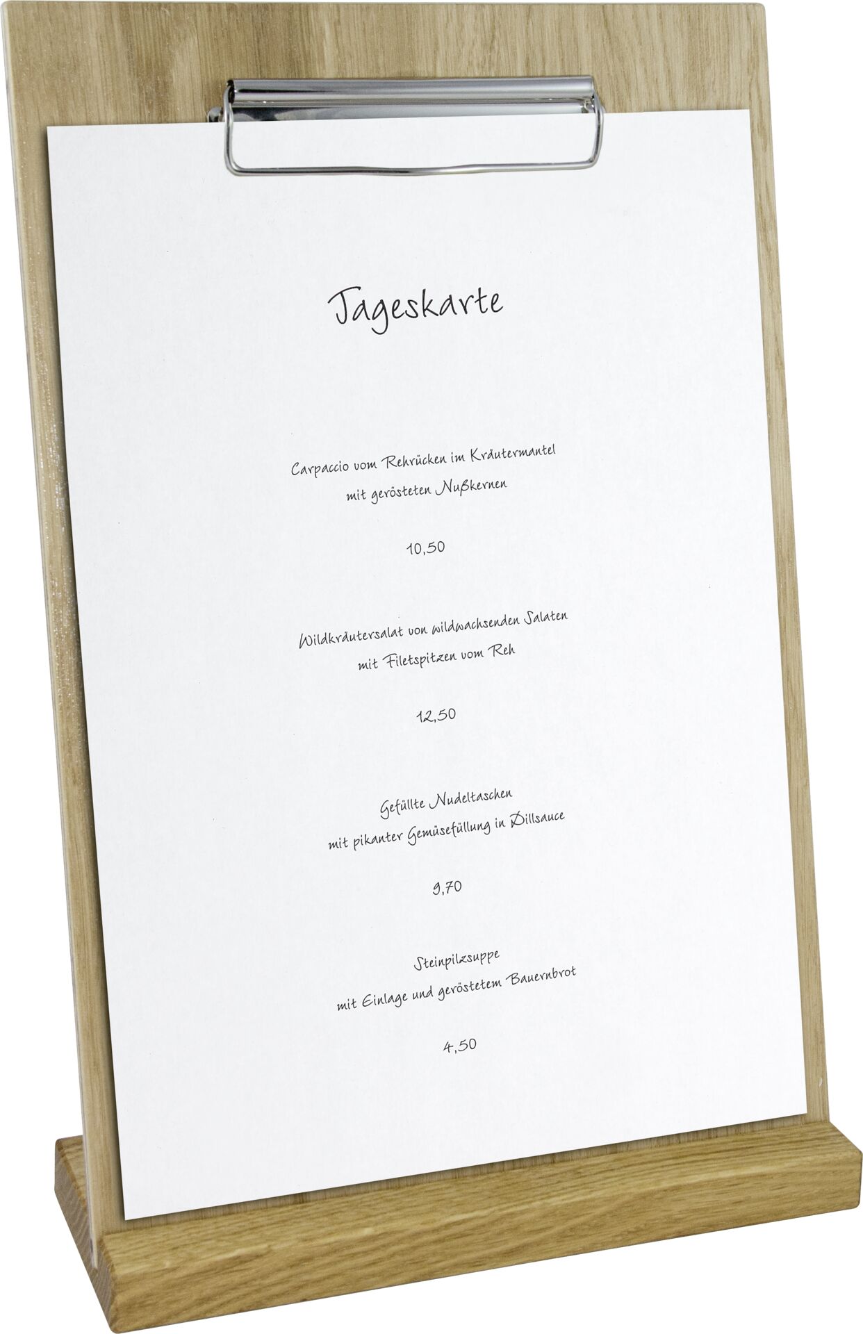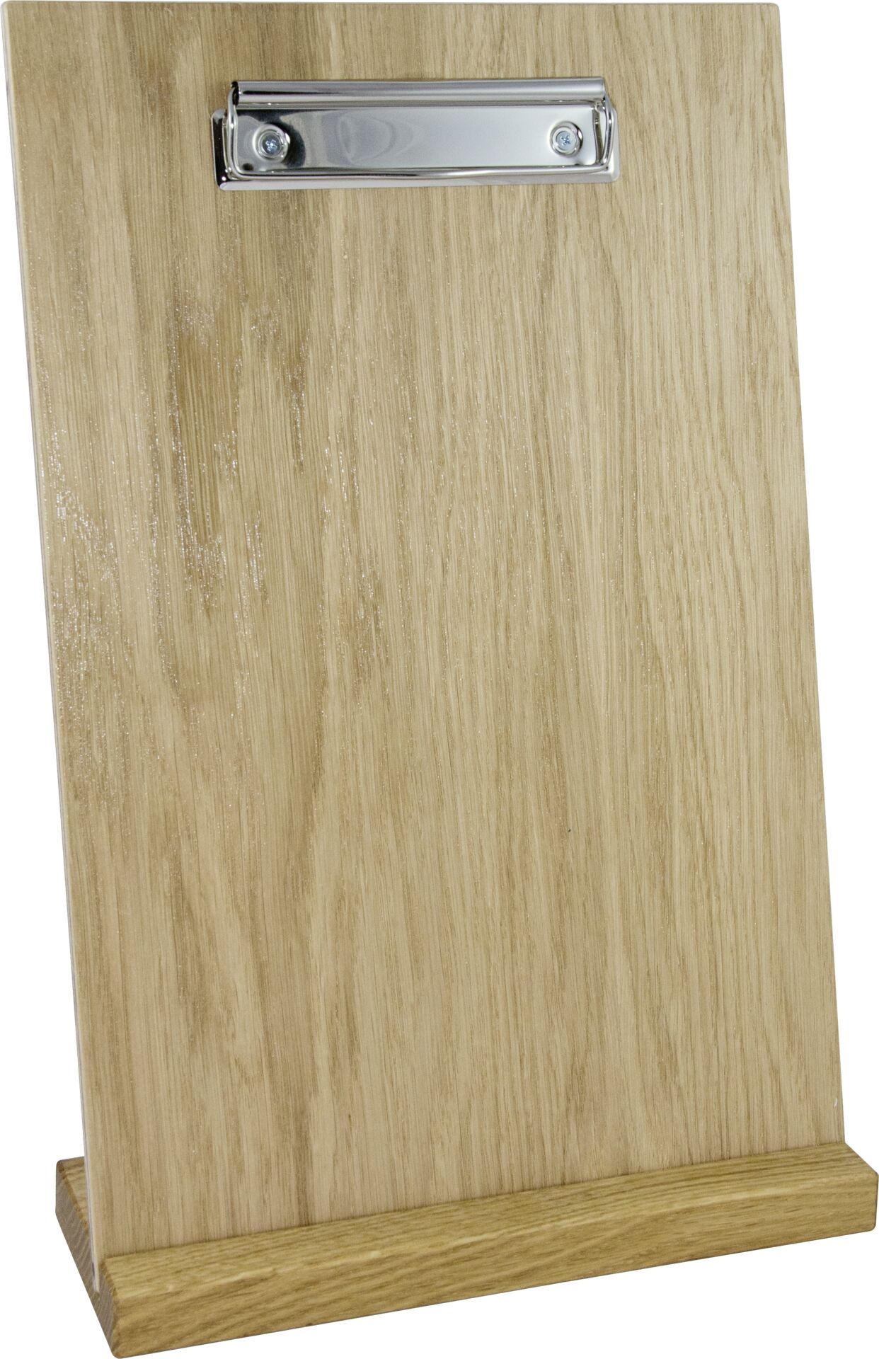 Farbe: Eiche hellLxBxH in cm: 23x33x0,5Format: A4Jetzt auch in dunkelbraun!Eichenholz. Mit Klemmleiste. Abgerundete Ecken. Mit dem Speisekarten-Klemmbrett kann ganz einfach die Tageskarte oder Ihr speziell auf den Gast abgestimmtes Menü ausgetauscht werden. Die passende Klemmbretthalterung bitte separat dazu bestellen.