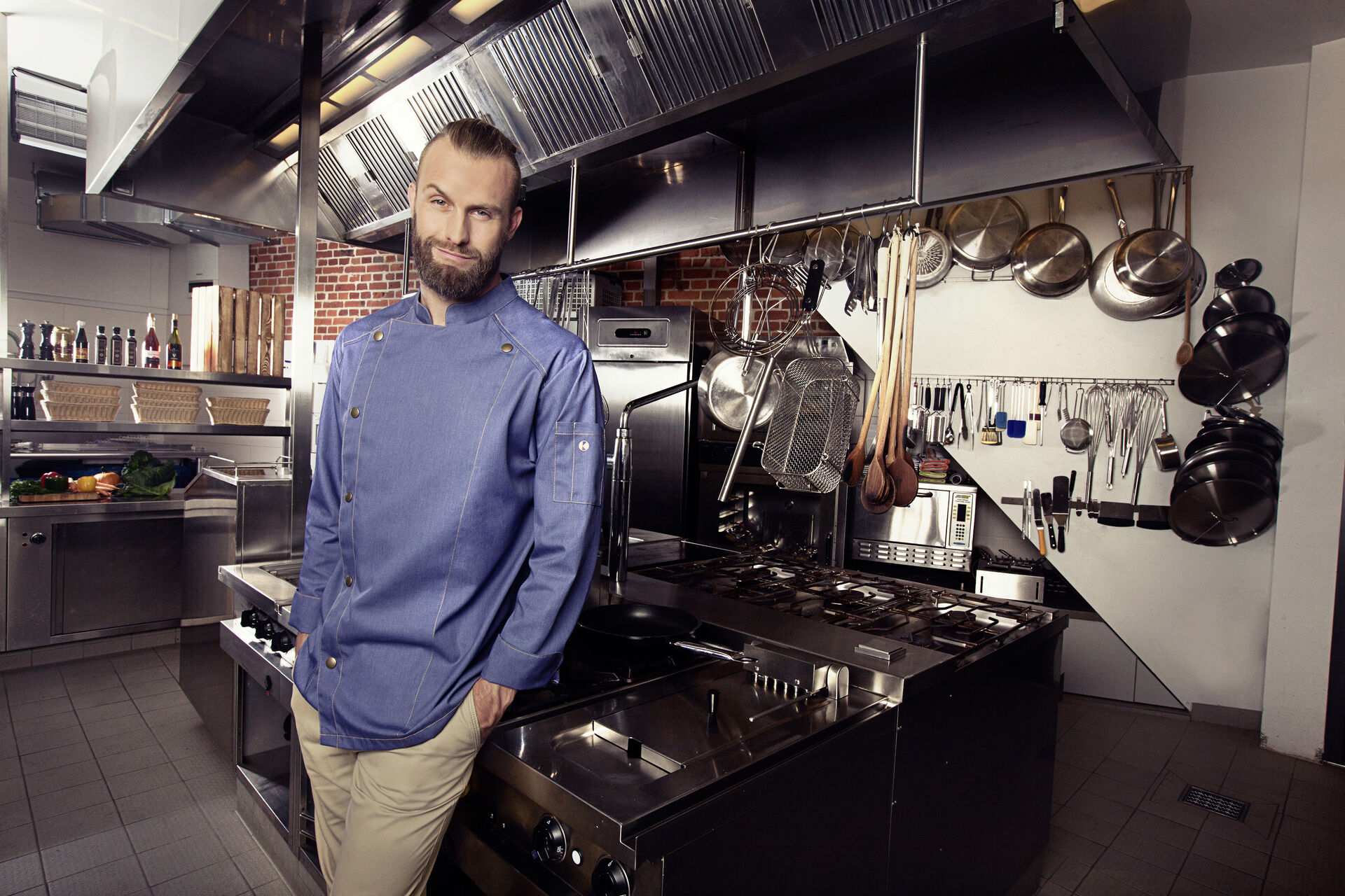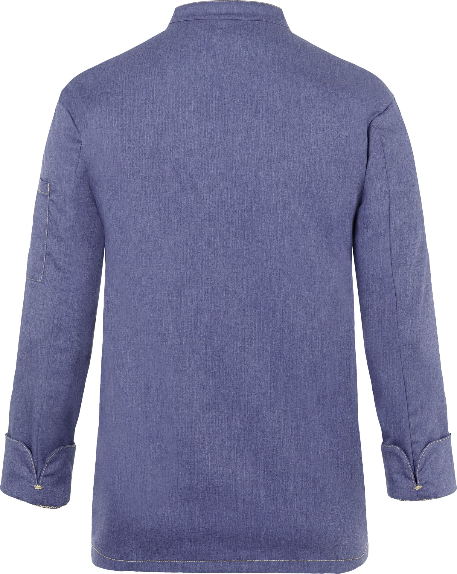 Weitere Größen und Farben auf Anfrage!Farbe: Vintage blue. Trendige Kochjacke inJeans-Optik mit schlanker Silhouette. Kontrastfarbige Steppnähte für den originalen Jeans-Look. Asymmetrisch geschlossene, einreihige 5-Knopf-Jacke mit Druckknöpfen zum schnellen Öffnen und Schließen. Ärmelmanschetten mit Schlitz. Aufgesetzte Ärmeltasche links mit praktischem Stiftfach. Industriewäschetauglich�(95°C). 65%�Polyester/ 35%�Baumwolle. Köpergewebe, 195�g/m². Hochveredelt, gekrumpft, waschecht, pflegeleicht. Größe: 50