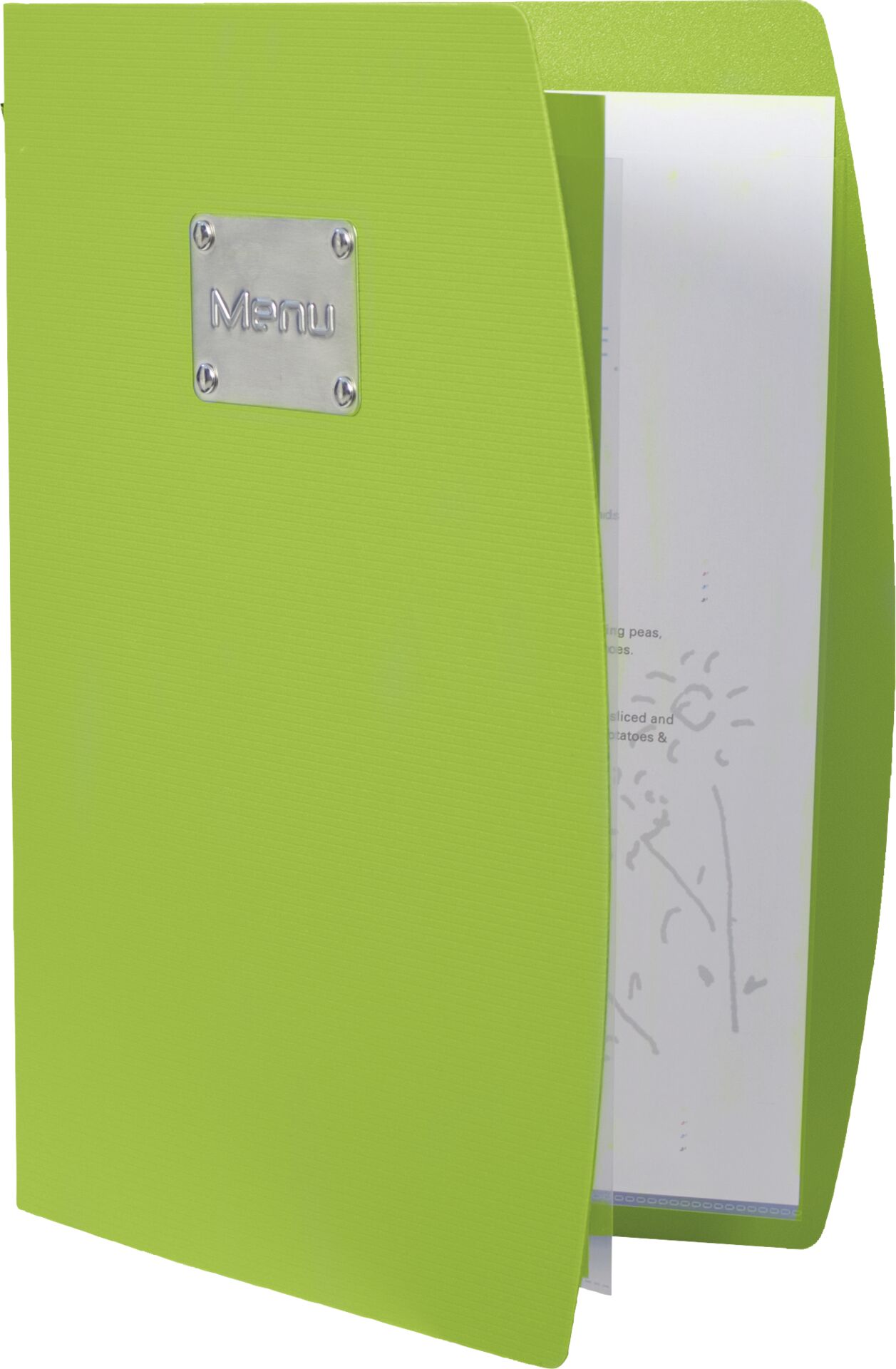Speisekarte innen - mit Gummiband und DoppeleinlageModerne Strukturkarte aus Kunststoff (PP). Edelstahlschild mit Aufdruck "Menu?, inkl. 1 Doppeleinlage. Fürbis zu 10 Einleger geeignet. Heftung: Gummiband mit Doppeleinlage (4 Seiten). Leicht zu reinigen.Farbe: limoneAusführung: Menükarte "Beach"Farbe: limone