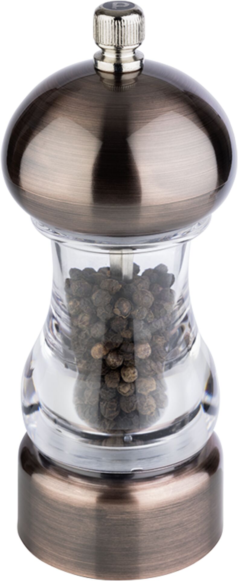 Acryl. Stufenlos einstellbarer Mahlgrad. &OSlash; 6,0 x Höhe: 15,0 cm. Nicht spülmaschinengeeignet. Farbe: kupfer/ klar.Material Mahlwerk: CarbonstahlAusführung: Pfeffermühle
