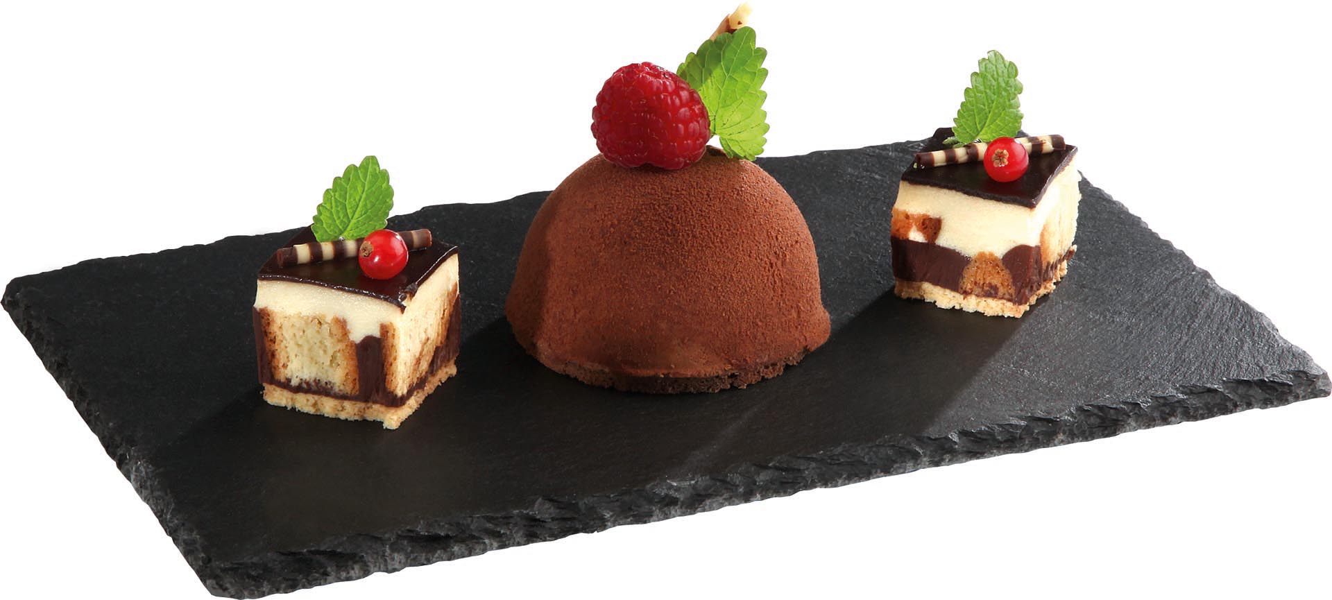 Perfekt für Buffetständer „Riser"Naturschiefer. Mit Antirutsch-Füßchen. Mit lebensmittelechtem Speziallack versiegelt. Fett- und wasserdichte Oberfläche. Gebrochene Kante. Hervorragende Kältespeicherung durch Naturschiefer.Ausführung: quadratischLxB in cm: 30,0x30,030x30