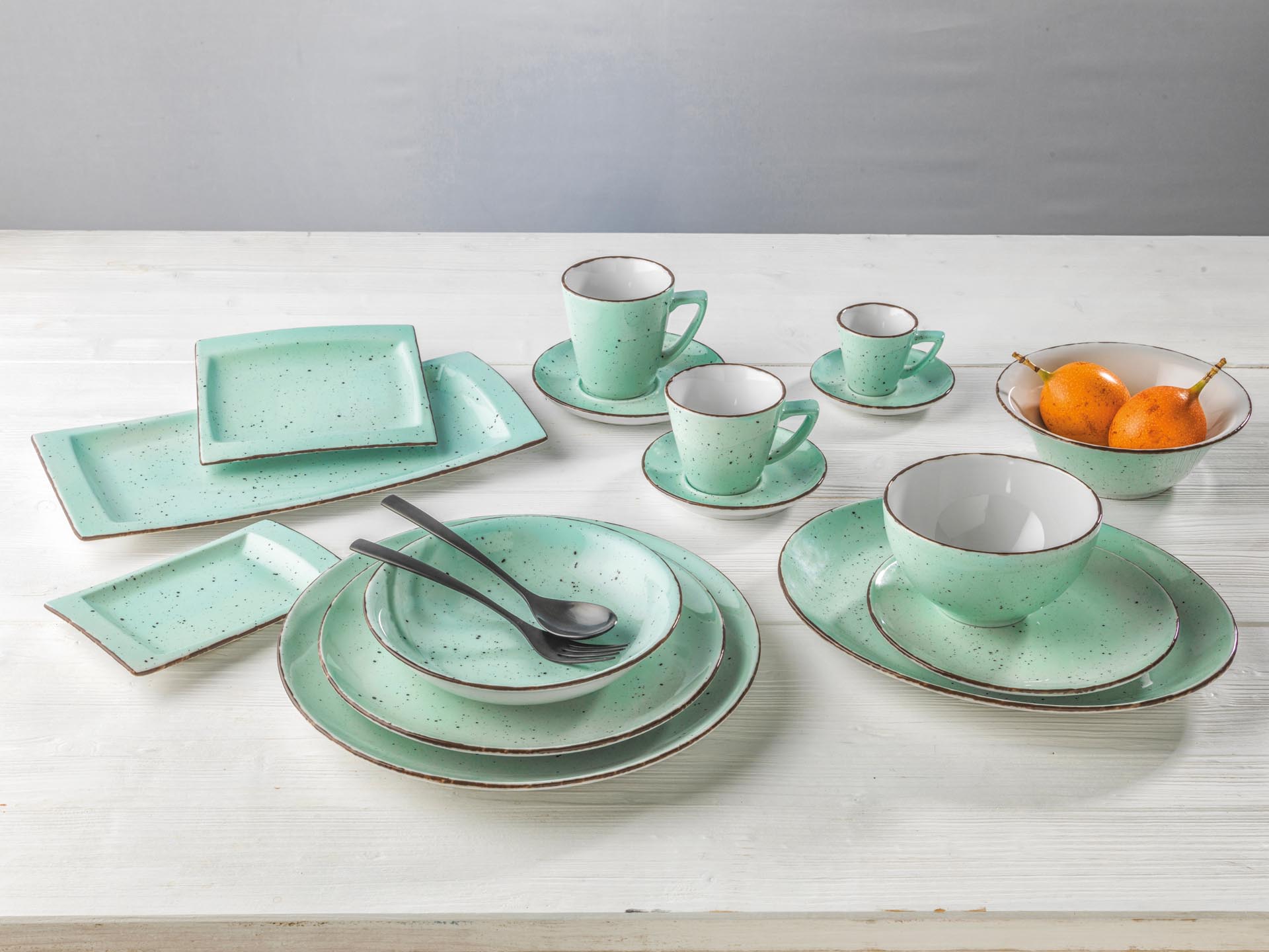 Porzellan. Grundfarbe mint (Farbverlauf bewusst unregelmäßig), Rand braun und Spiegel braun gesprenkelt. Mischsortierung. Spülmaschinengeeignet.Ausführung: Platte flach eckigMaße/Inhalt: 36x18 cmFarbe: mint