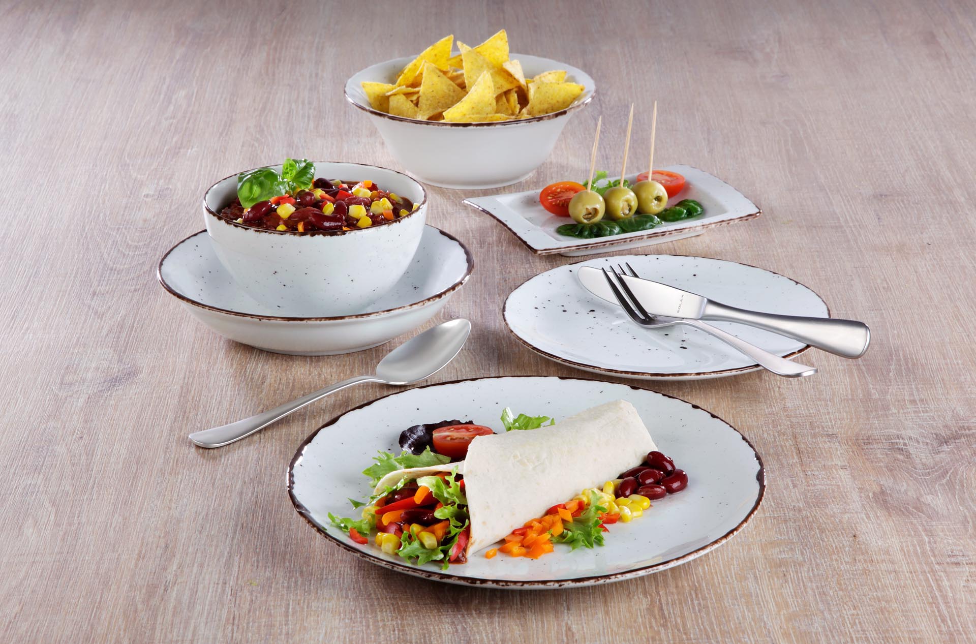 Porzellan. Grundfarbe weiß, Rand braun und Spiegel braun gesprenkelt. Mischsortierung. Spülmaschinengeeignet.Ausführung: Platte flach eckigMaße/Inhalt: 36x18 cmFarbe: weiß