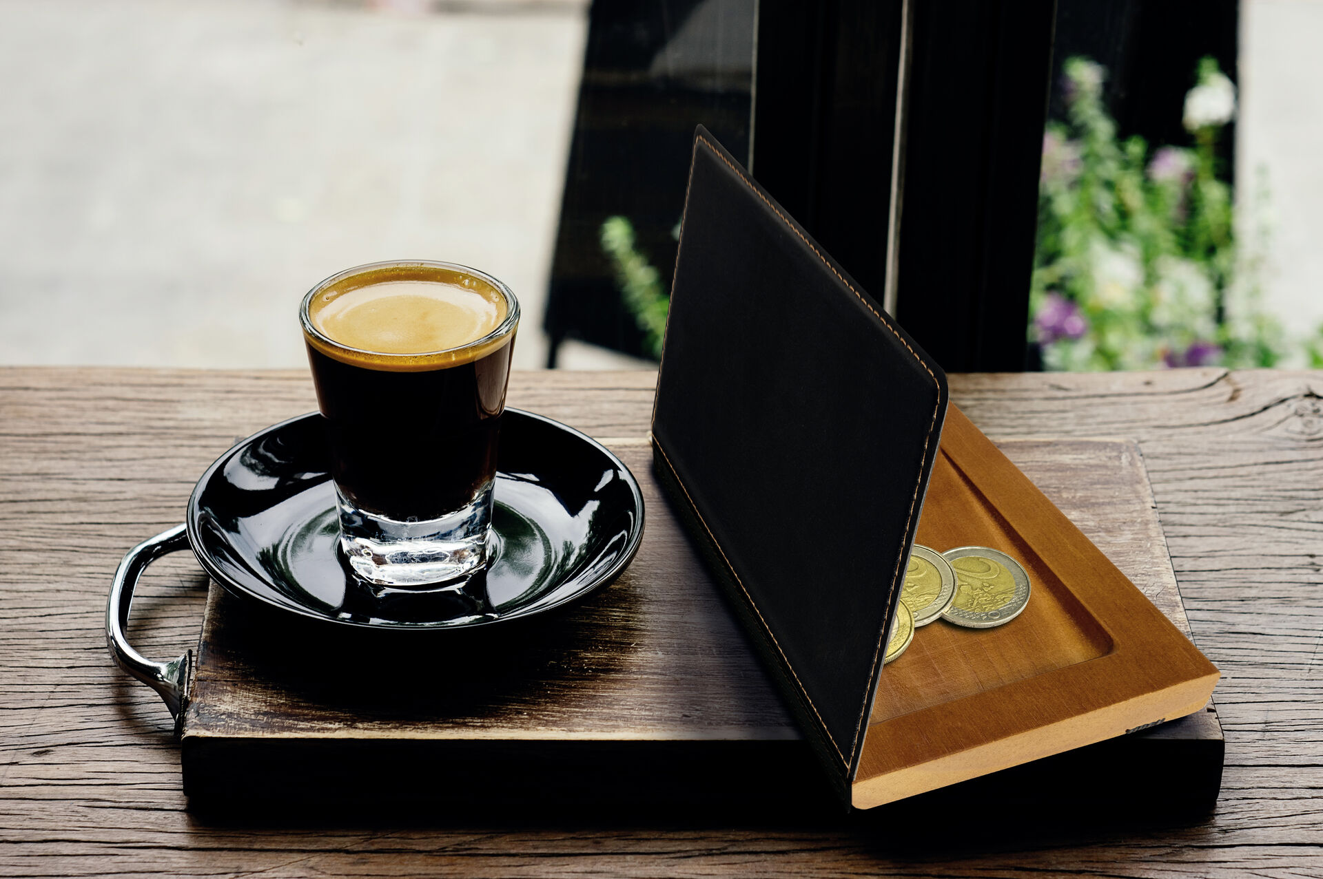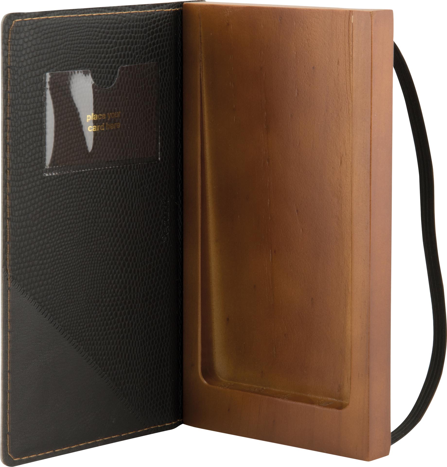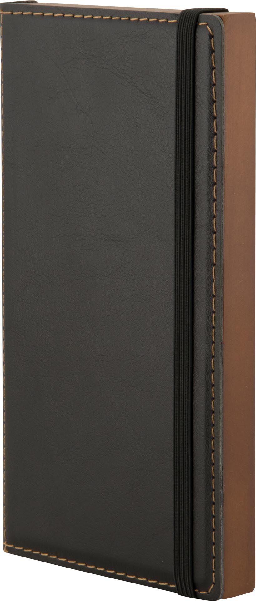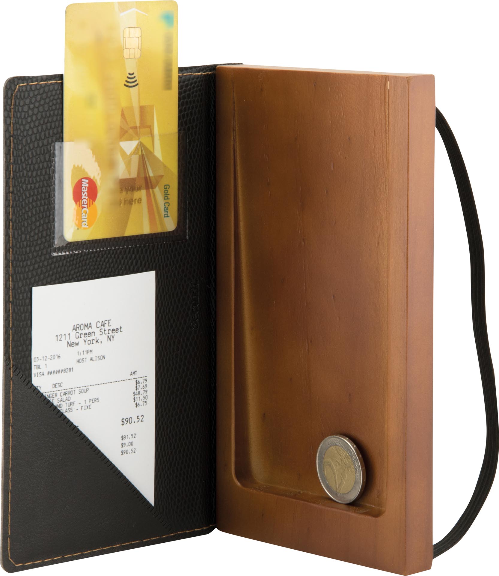 LxBxT in cm: 18,4x10,4x2Polyurethan Rechnungsmappe (Lederoptik) mit handgestickten Seitenrändern und hölzernem Münzhalter. Einsteckfach für Karten. Mittels elastischem Band leicht zu schließen.