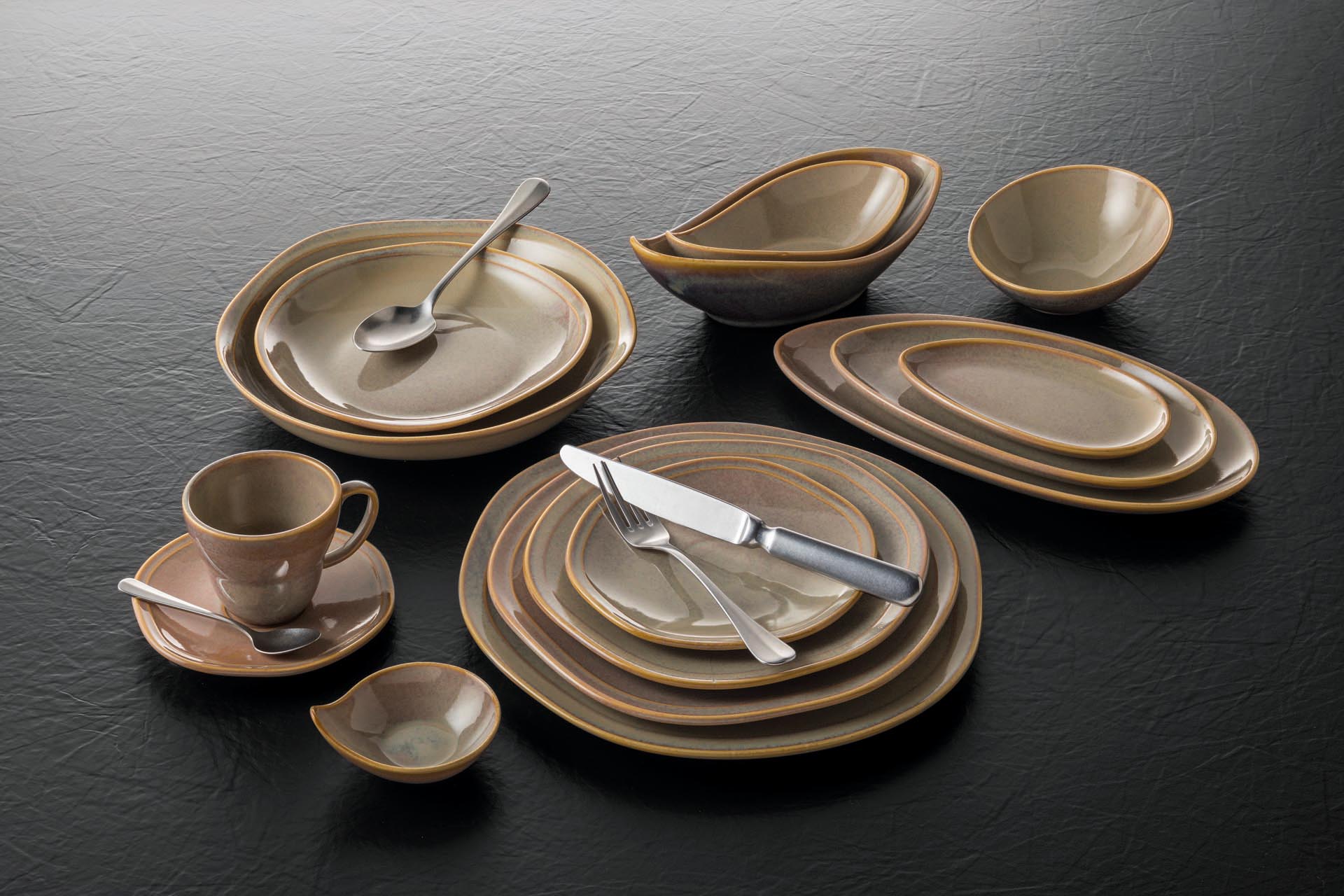 Porzellan in Keramikoptik. Mischsortierung. Glasur in farblich ineinander übergehenden Beige- und Erdtönen und einem unregelmäßigem beigen Rand - macht jedes Stück zum Unikat. Spülmaschinengeeignet.Ausführung: SchaleMaße/Inhalt: 22,9x11,8x7,5cm / 375ml