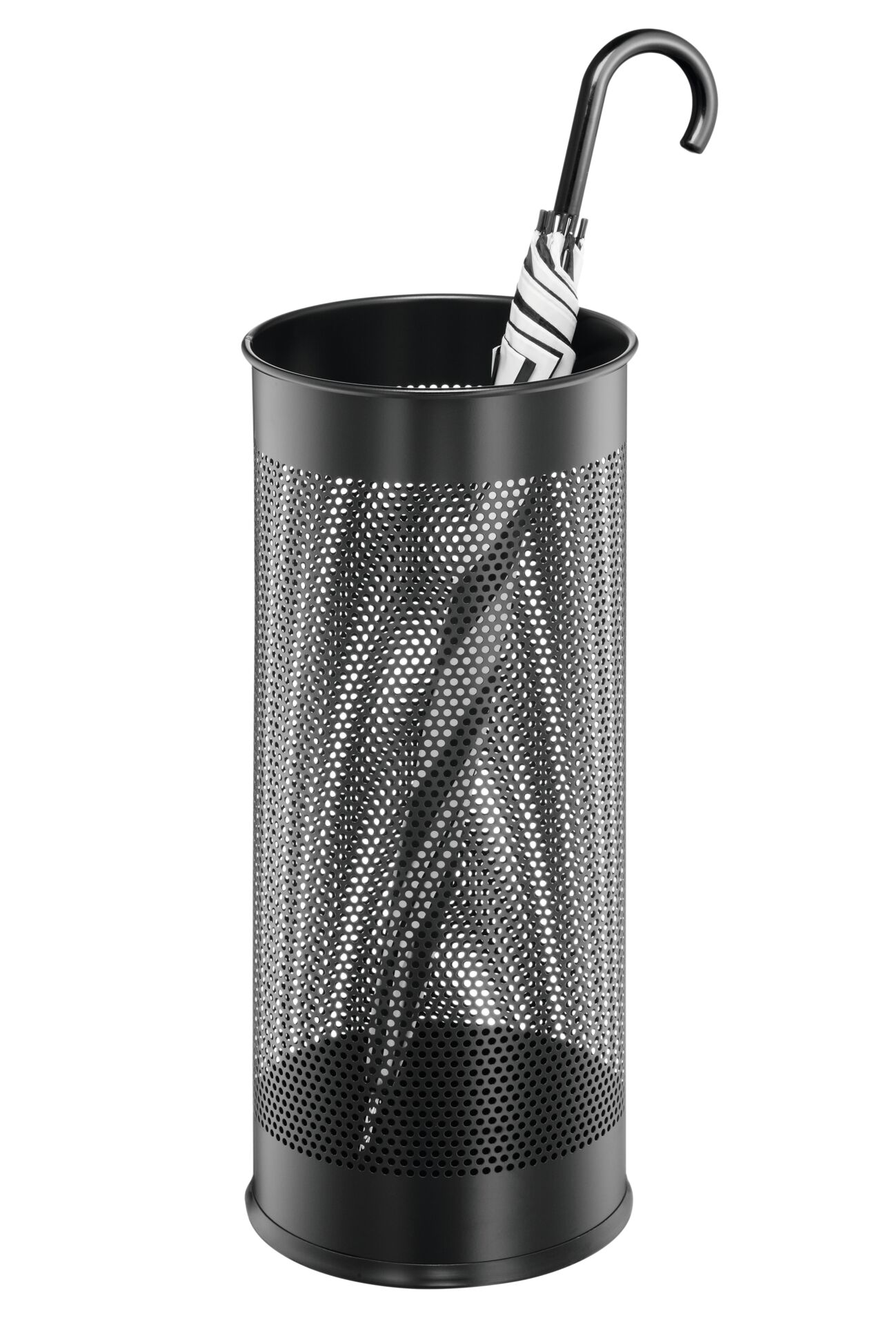 Schirmständer aus Metall. Lackiert und perforiert, mit schonendem Gummiring am Ständerboden. &OSlash;xH: 26x62cm. Inhalt: 28,5LFarbe: schwarz