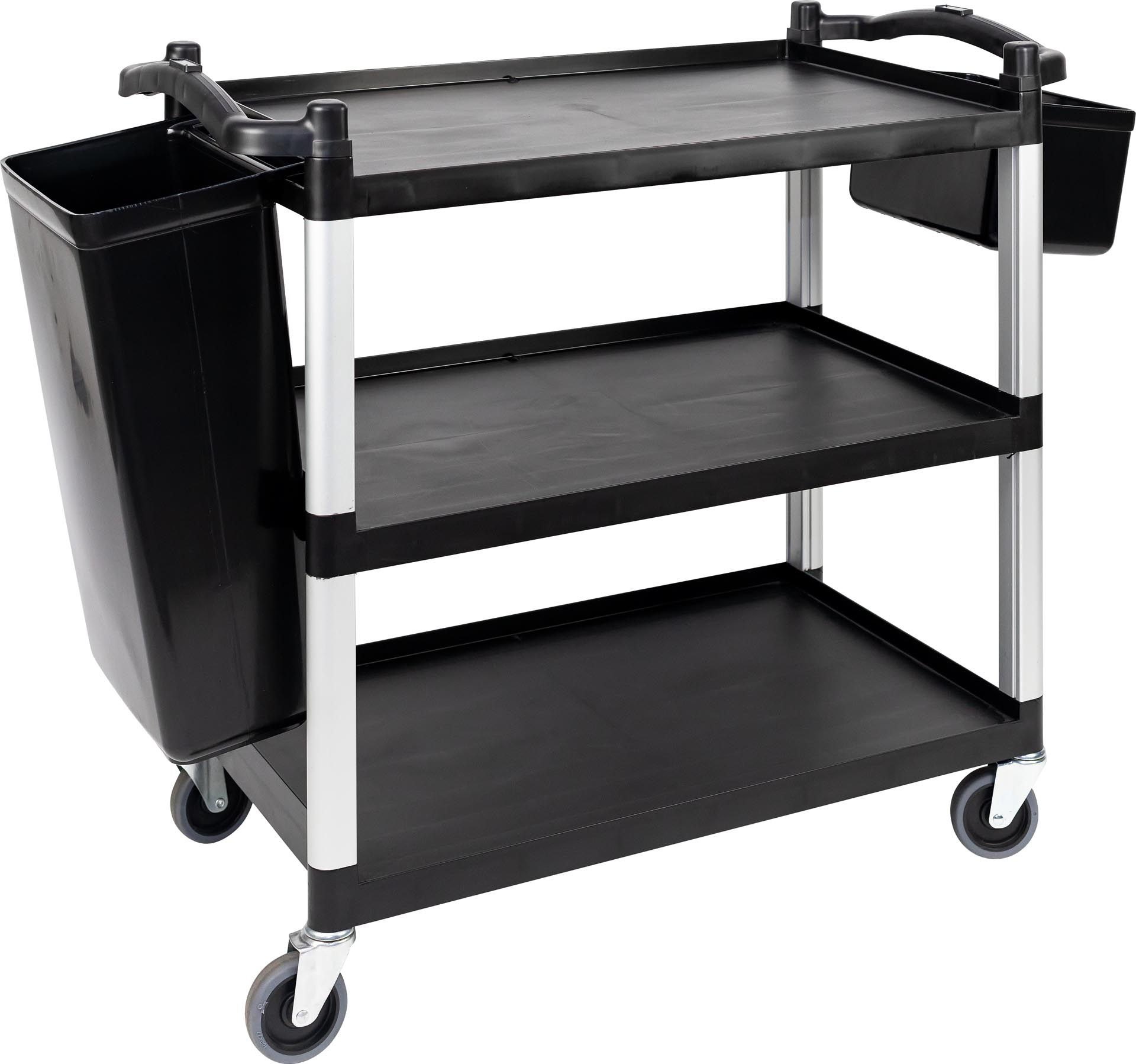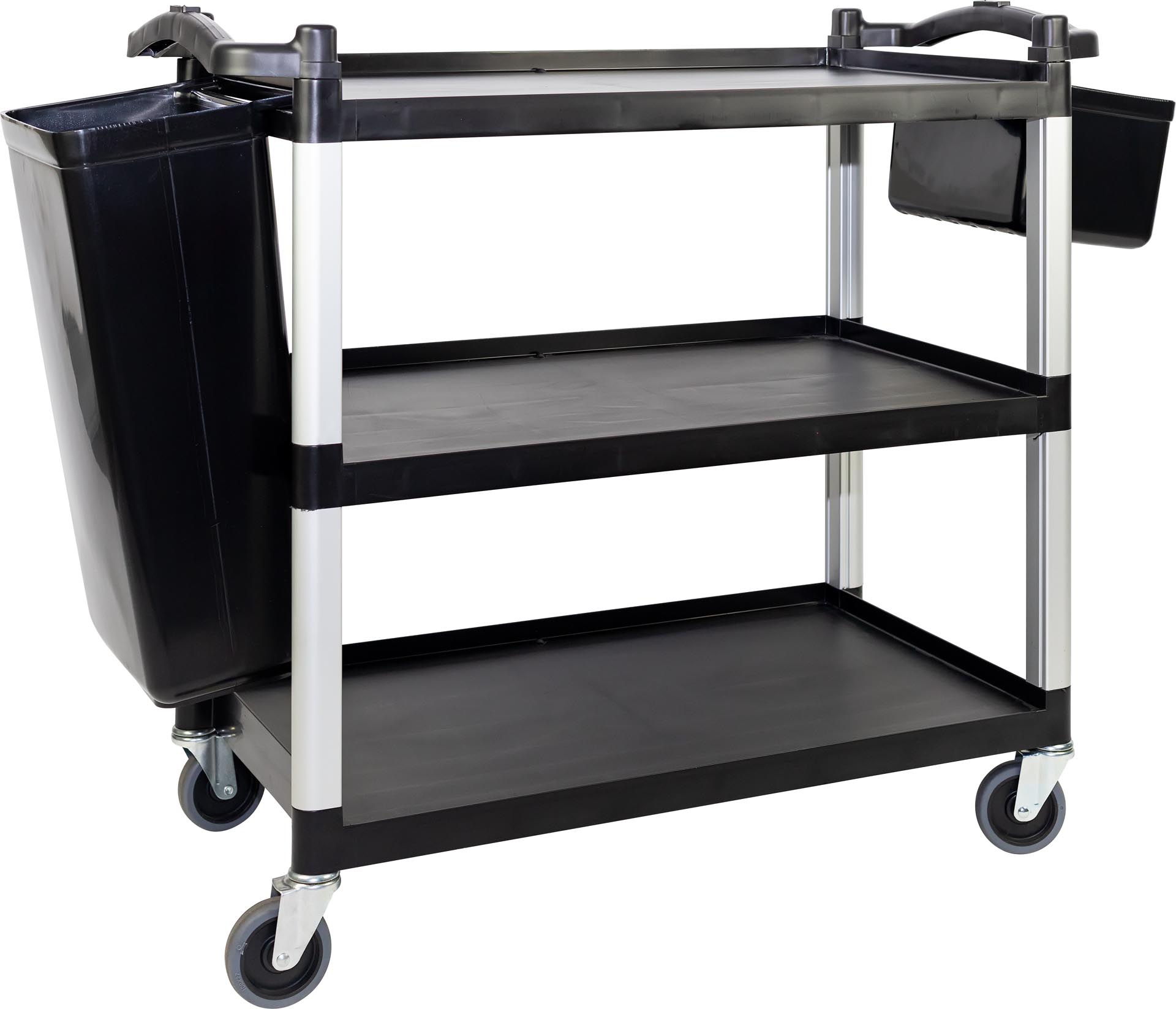 Ausführung: AbfallbehälterLxBxH in cm: 33,5x23,1x44,5cmPP. Schwarz. Robuster Behälter zum Einhängen am obersten Bord unseres Servierwagens.