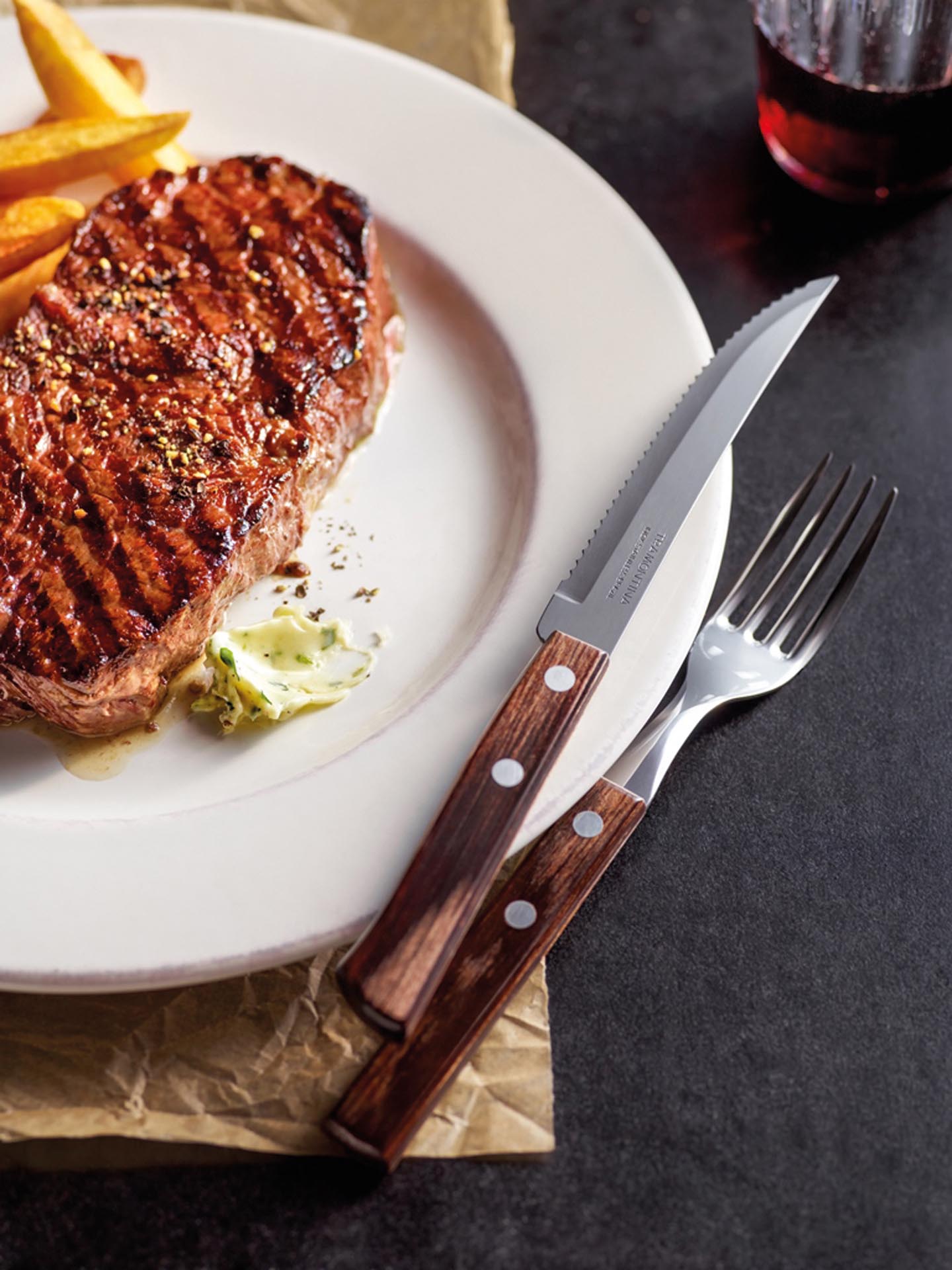 Der Holzgriff (Kiefernholz) wird in feinen Schichten mit Harz imprägniert, unter Hitzeeinfluss gepresst, zugeschnitten und poliert. Dadurch werden die Holzschichten und Poren des Holzes fest verschlossen, sodass keine Feuchtigkeit eindringt und der Holzgriff spülmaschinengeeignet ist. Edelstahl-Nieten garantieren eine sichere Fixierung von Griff und Klinge. Die extra scharfe und widerstandsfähige Schneide gewährleistet beste Schneideeigenschaften. Klinge aus rostfreiem Edelstahl AISI 420 und Gabel aus AISI 430. 5 Jahre Garantie. Ausführung: GabelLänge in cm:: 20Farbe: braun