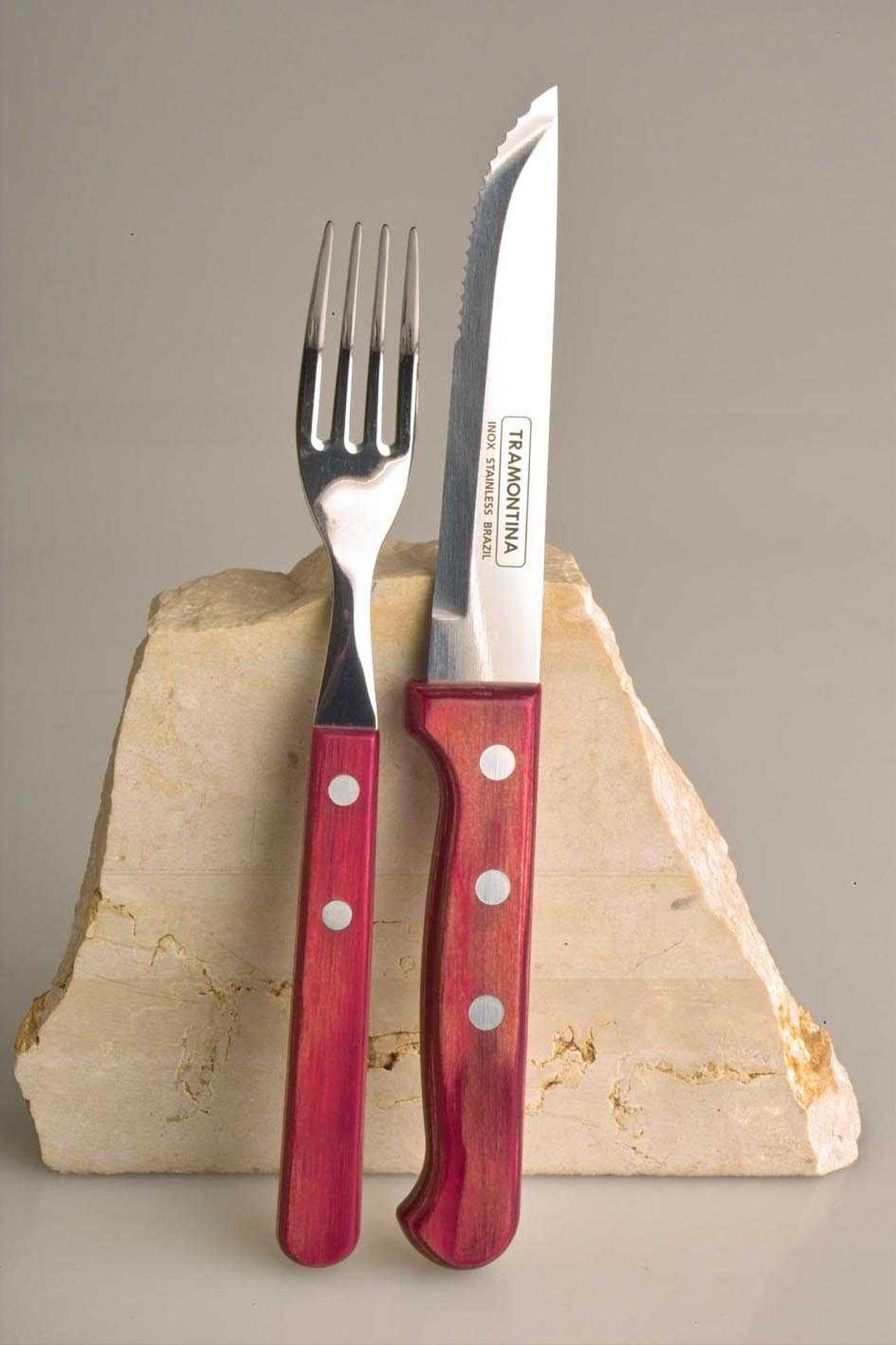 Der Holzgriff (Kiefernholz) wird in feinen Schichten mit Harz imprägniert, unter Hitzeeinfluss gepresst, zugeschnitten und poliert. Dadurch werden die Holzschichten und Poren des Holzes fest verschlossen, sodass keine Feuchtigkeit eindringt und der Holzgriff spülmaschinengeeignet ist. Edelstahl-Nieten garantieren eine sichere Fixierung von Griff und Klinge. Die extra scharfe und widerstandsfähige Schneide gewährleistet beste Schneideeigenschaften. Klinge aus rostfreiem Edelstahl AISI 420 und Gabel aus AISI 430. 5 Jahre Garantie. Ausführung: GabelLänge in cm: 20,5Farbe: mahagoni
