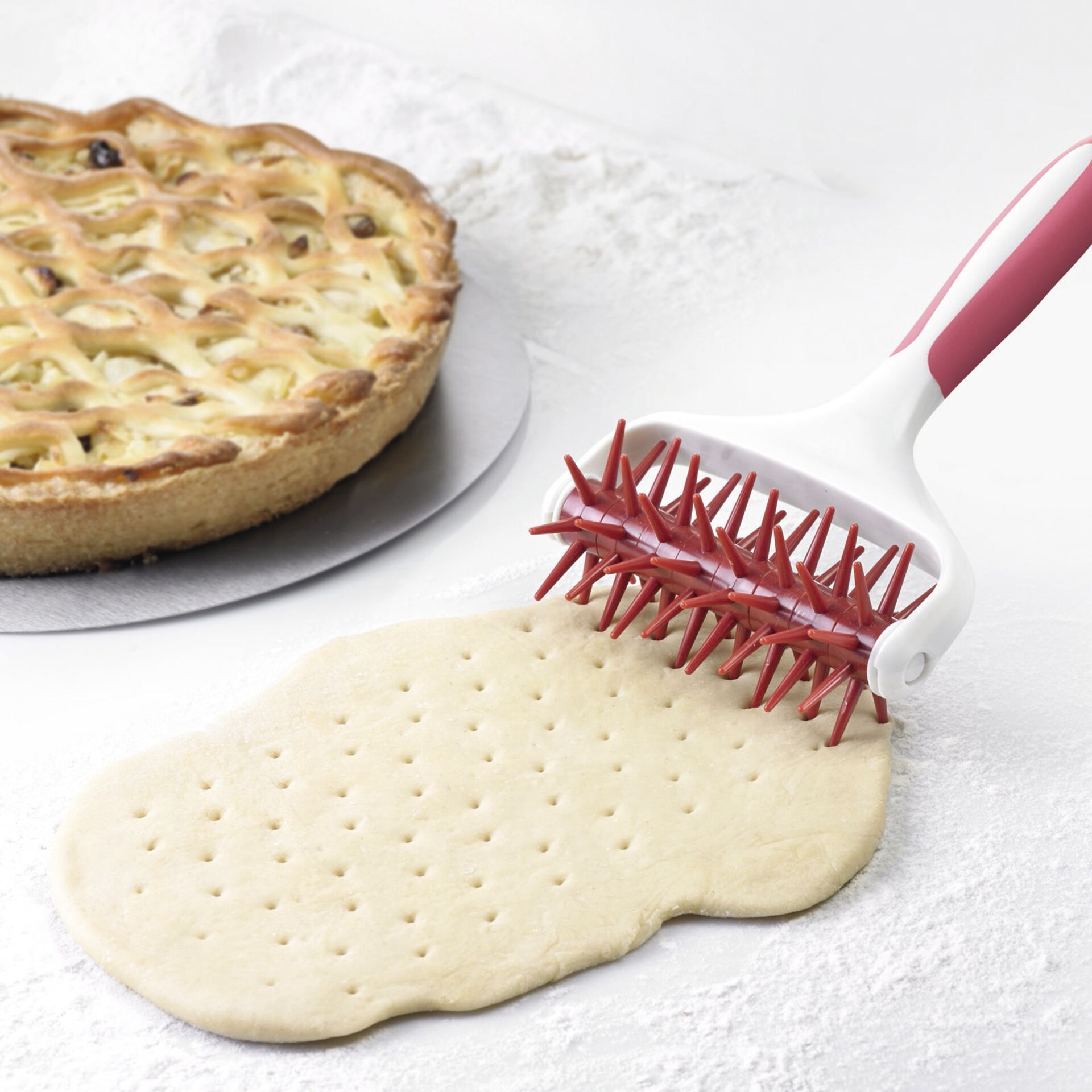 B in cm: 20Material: TPE = Thermoplastische Elastomere u. ABS = Acrylnitril-Butadien-Styrol, gummierter Griff, die ideale Hilfe, um den Teigboden mit Löchern zu versehen, vermeidet Blasenbildung beim Backen, spülmaschinengeeignet.
