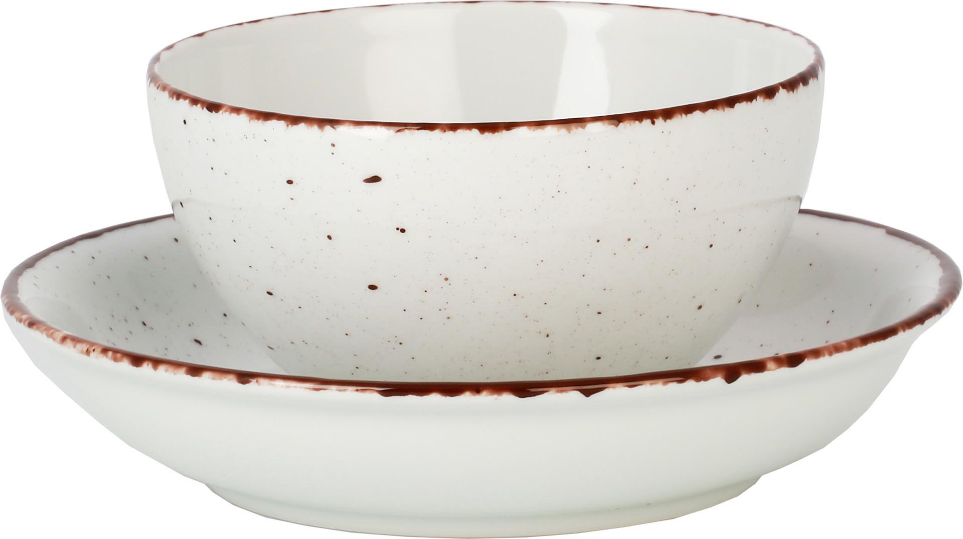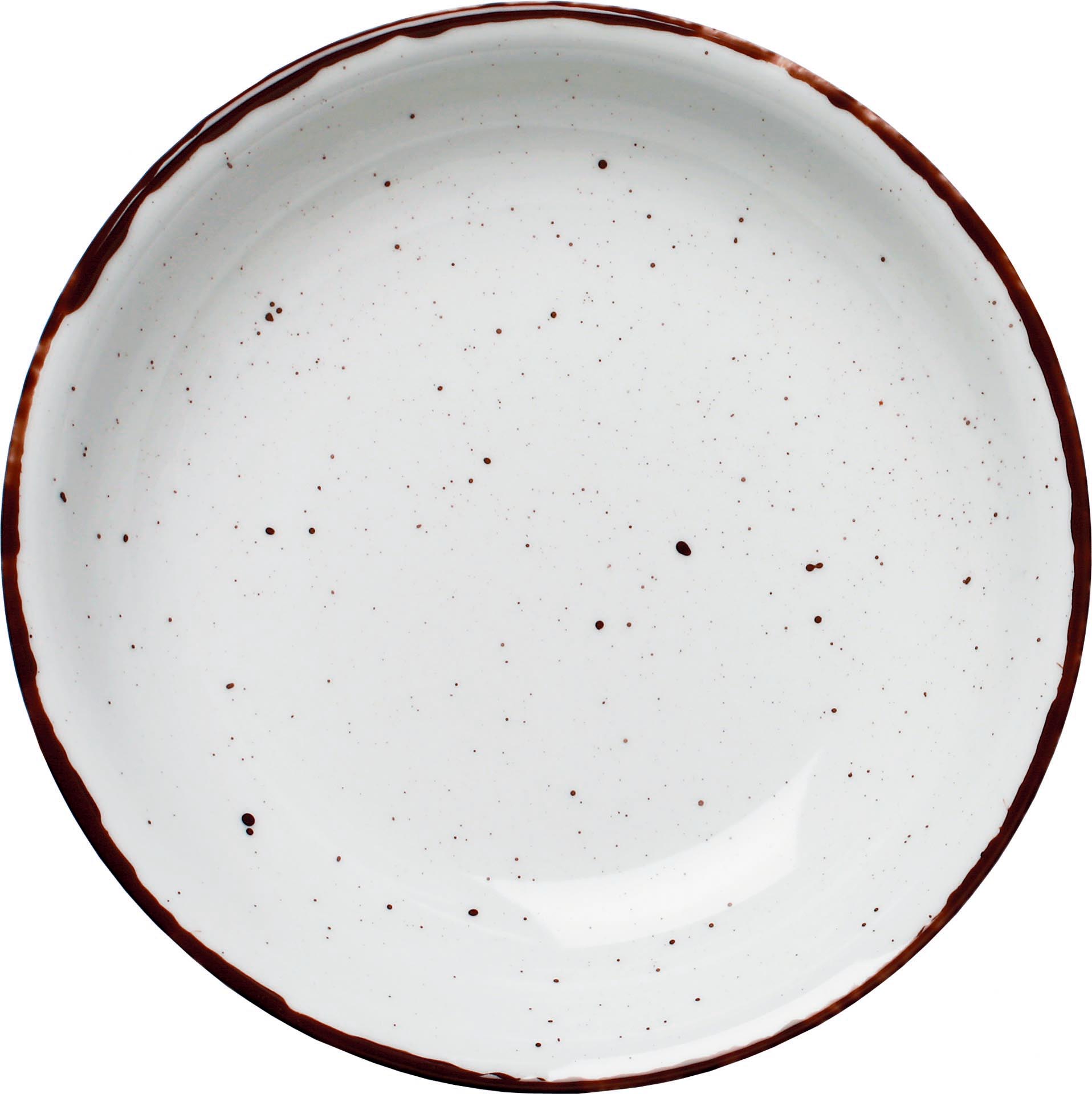Porzellan. Grundfarbe weiß, Rand braun und Spiegel braun gesprenkelt. Mischsortierung. Spülmaschinengeeignet.Ausführung: Teller tief Coup-FormMaße/Inhalt: Ø 20 cmFarbe: weiß