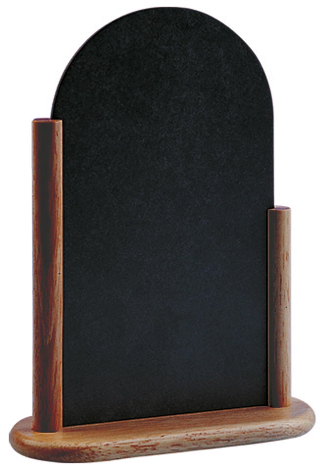 Gestell aus Holz. Inklusive einer halbrunden doppelseitigen Kreidetafel, somit beidseitig beschriftbar.Farbe: dunkelbraunBxL in cm: 16x21