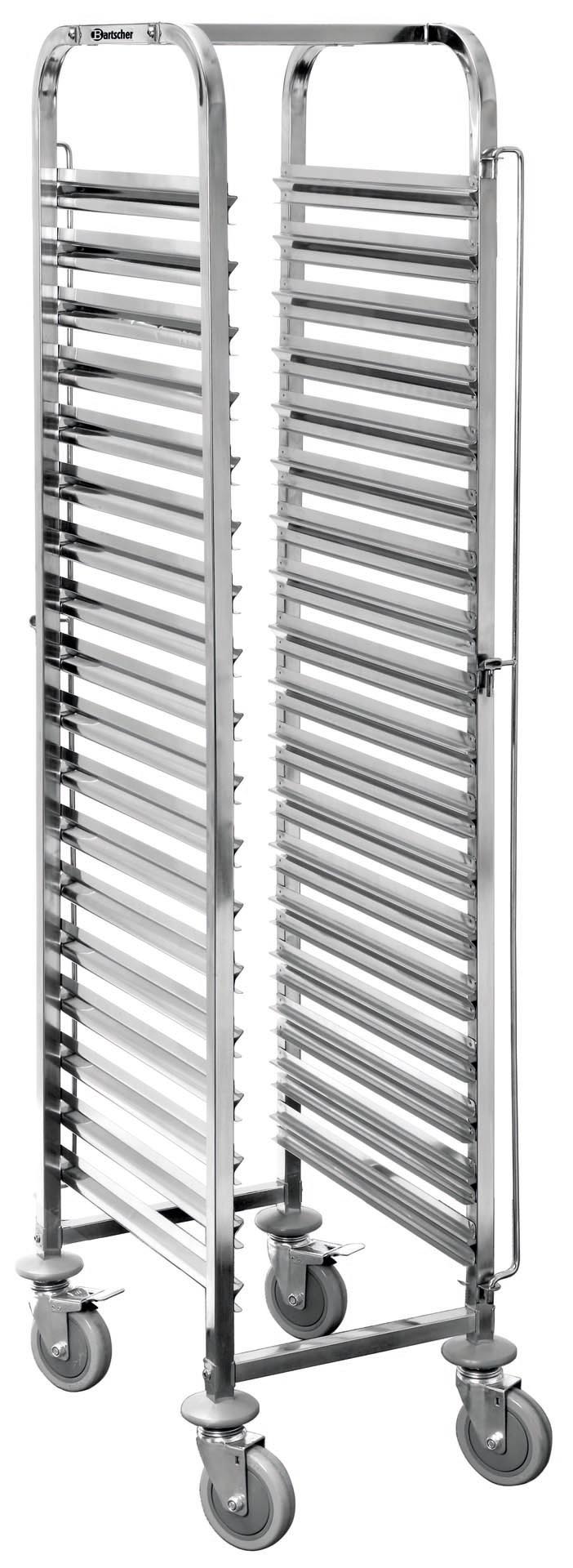 BxTxH in cm: 38,5x55x173,5Fassungsvermögen 15 GN-Tabletts, GN-Behälter oder GN-Roste. Edelstahl, mit stabilem 25x25 mm Vierkantrohr. Eingeschweißte U-Profil-Führungsschienen sorgen für hohe Stabilität und Kippsicherung. An den Enden der Führung ist ein drehbarer Arretierstab zur Durchschubsicherung angebracht. Abstand der Auflagen 8 cm. Fahrbar mittels 4 Lenkrollen, davon 2 feststellbar. Lieferung ohne Tabletts, Behälter oder Roste. Selbstmontage.