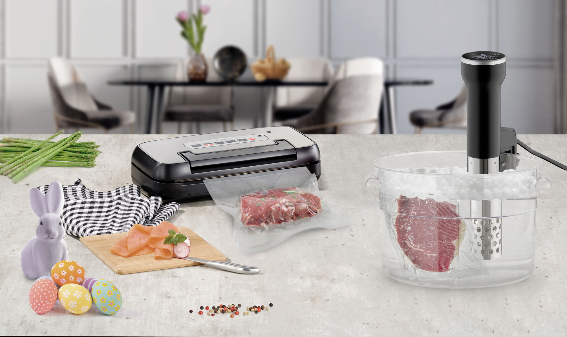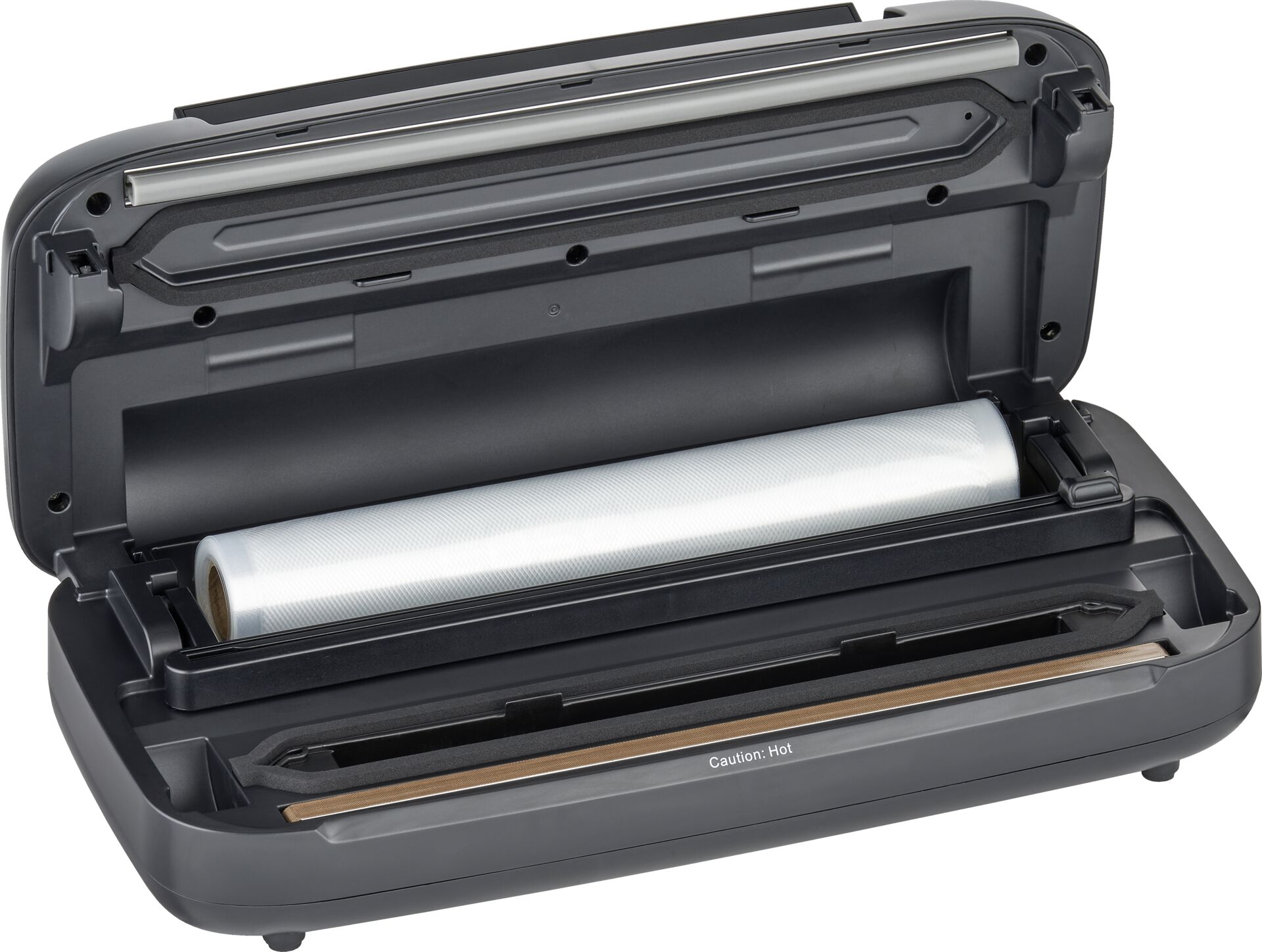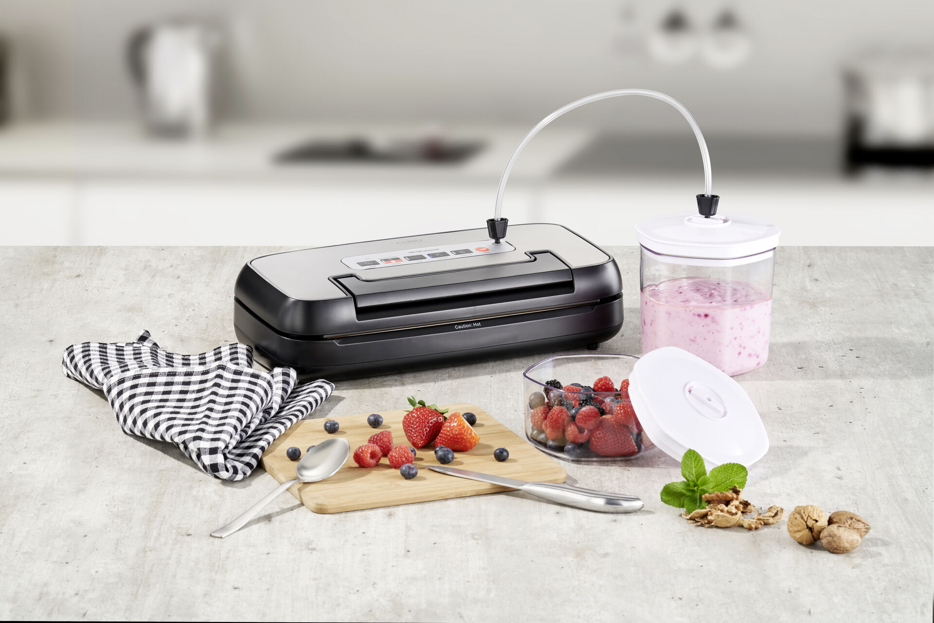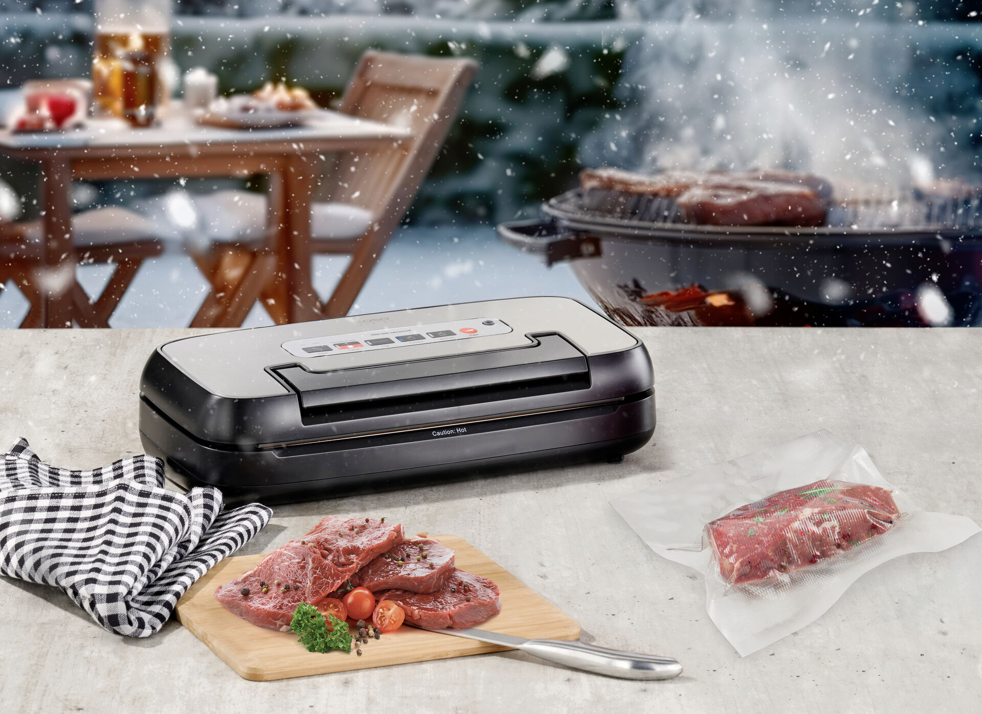 BxHxT in cm: 40x10,5x18Anschlusswert: 220-240V/110W/50HzHochwertige Edelstahlfront mit Antifingerprint-Beschichtung, Multi-Zyklus: bis zu 125 Schweißvorgänge non-stop ( ohne zu überhitzen ), Maße B 400 x H 105 x T 180mm.Pumpe ca. 12L/min. und einem max. Unterdruck von bis zu -0,8 bar, 2,5mm dicke, stabile Schweißnaht für Beutel bis. max. 30cm Breite und beliebiger Länge, automatisches Vakuumieren und Verschweißen, manuelles Verschweißen, regulierbareSchweißzeit für trockene und feuchte Lebensmittel, Pulse-Funktion: manuell regulierbare, stufenlose Vakuumstärke, ideal für weiche, empfindliche Lebensmittel, Marinier-Funktion, integriertes Rollenfach mit praktischem Cutter zum Zuschneiden der Folienrollen, praktische Einhandbedienung, herausnehmbare Auffangschale für angesammelte Flüssigkeit, elektronische Temperaturüberwachung,inkl. 1 Profi-Rolle 28x300cm, 10 Profi-Beutel 20x30cm, 1 Vakuumierschlauch. Passende Beutel und Schläuche: 143510, 143550, 17417, 17418, 17420 u