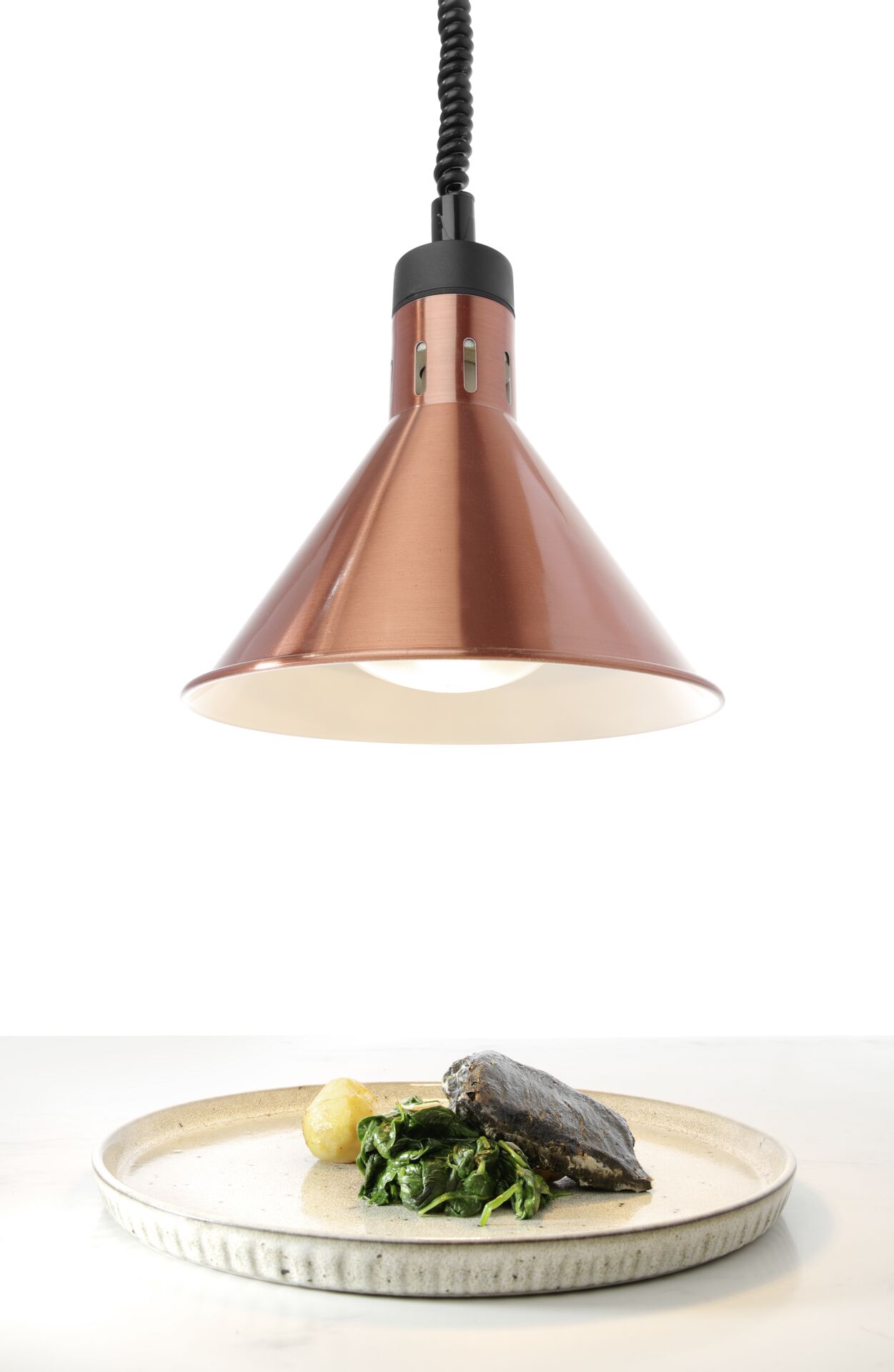 Aluminium. Sehr flexibel und individuell einsetzbar dank der regulierbaren Schnurlänge von 70 bis 150 cm. Die Wärmeleistung kann durch die Höheneinstellungder Lampe für jeden Bedarf reguliert werden. Der Ein-/ Ausschalter befindet sichauf der Oberseite der Lampe. Dank der bruchsicheren Glühbirne (inkl. 1x weiß) bestens geeignet zum Warmhalten von Speisen aller Art. &OSlash;xH in cm: 27,5x25,0.Farbe: KupferAnschlusswert: 230V/250WWEEE-Reg. Nr. WE 61118672