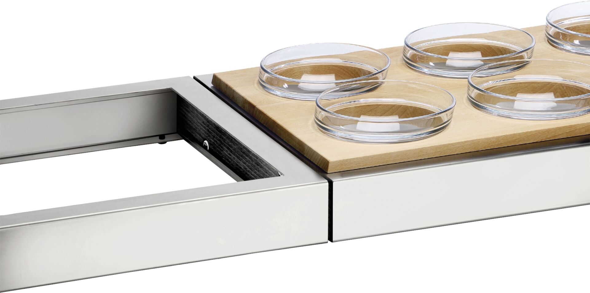 Element: dunkel, kleinHöhe in cm: 6,5Buche, dunkel. Zwischenstück, inkl. 8 Magneten, für Buffetsystem Rahmen. Mit Kabelaussparung.