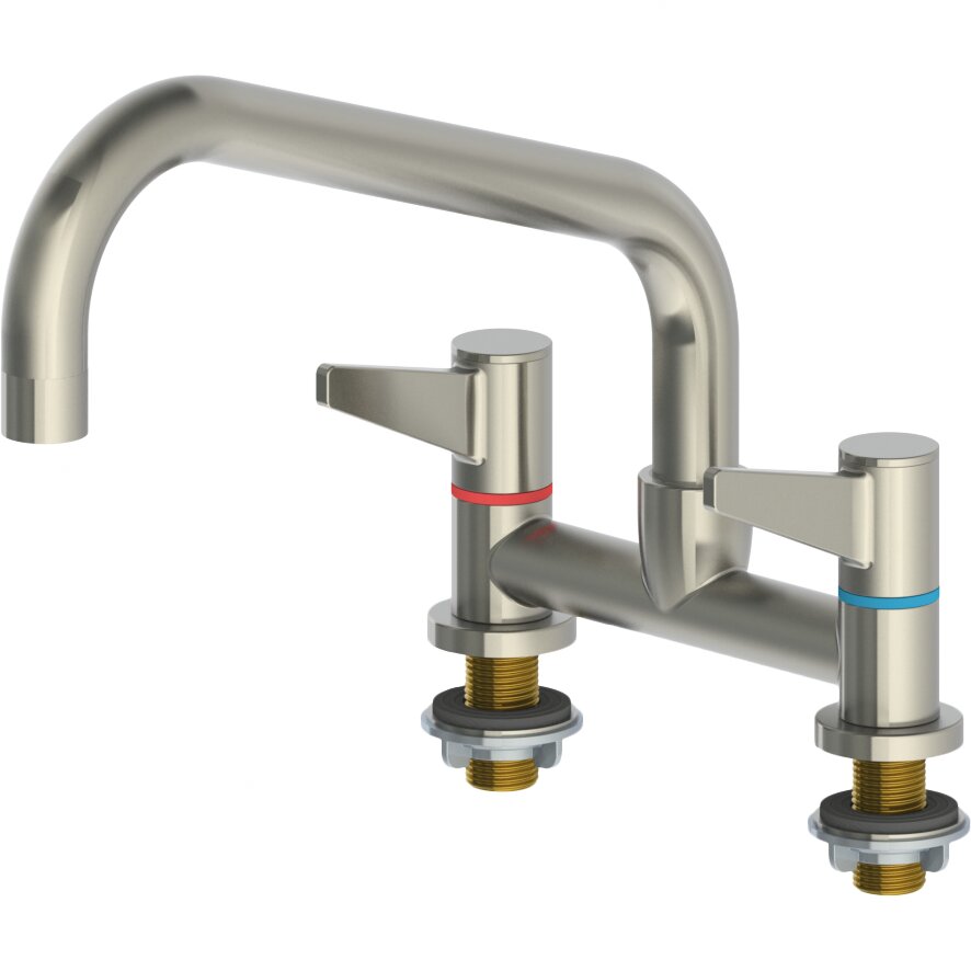 > Mischbatterie: Zweigriffmischbatterie Stand > Nenngröße 1/2? > Ausführung nur für Hochdruck > Betriebsdruck 1 - 6 bar (14.5 - 87 psi) > Keramikoberteile (Mischbatterie) > wärmeisolierende Griffe > schwenkbarer Auslauf > Ausladung L= 254 mm ,H = 120 mm > Rückflussverhinderer > heißwasserbeständig bis 80°C > Installation: Tischbohrung 2 x ø 23 mm, 150 mm zwischen den Bohrungen, gemessen von der Mitte der Bohrlöcher