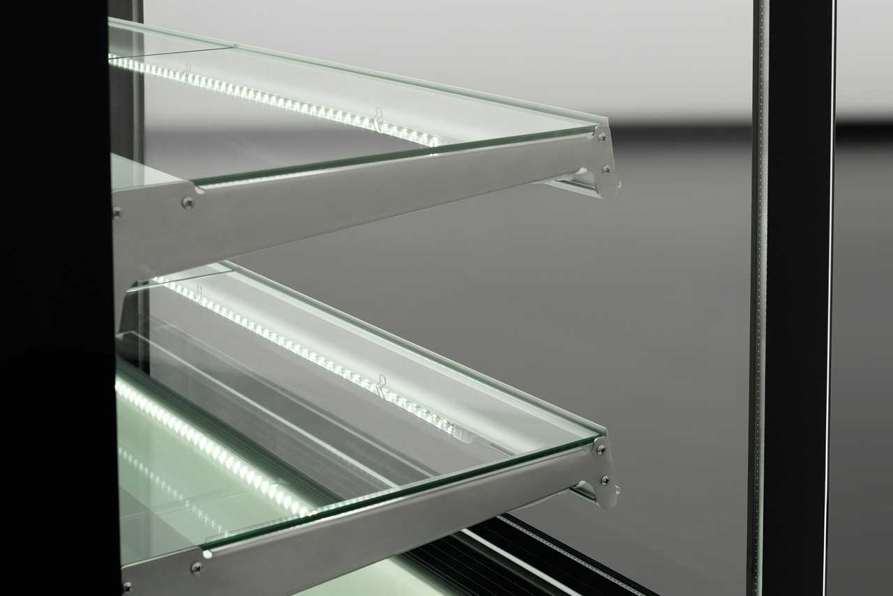 > Temperaturbereich: 2°C bis 8°C > Umluftkühlung, Kühlmittel: R290 > Material: Edelstahl, Glas und Kunststoff > eingebaute Kühleinheit > digitale Steuerung > automatische Kondenswasserverdunstung > Doppelverglasung > Antibeschlag-Luftkanäle für seitliche und vordere Außenscheibe > abnehmbare Schiebetüren > LED-Beleuchtung pro Etage > höhenverstellbare Einlegeböden > Regalabmessungen: 1 x 1100 x 310 mm, 2 x 1100 x 370 mm, Boden: 1140 x 370 mm > abnehmbare Glasregale und Kammerboden > 4 Rollen, 2 mit Bremsen
