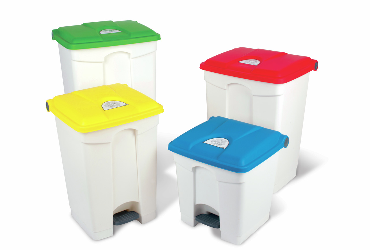 > Treteimer, rechteckig > Pedalmechanismus, stabil und geräuschlos > überlappender Deckel vermeidet Gerüche > glatte Oberflächen und abgerundete Ecken > einfache Reinigung und Desinfizierung > Polypropylen, robust und haltbar > inklusive 6 Aufkleber mit Wertstoffpiktogrammen