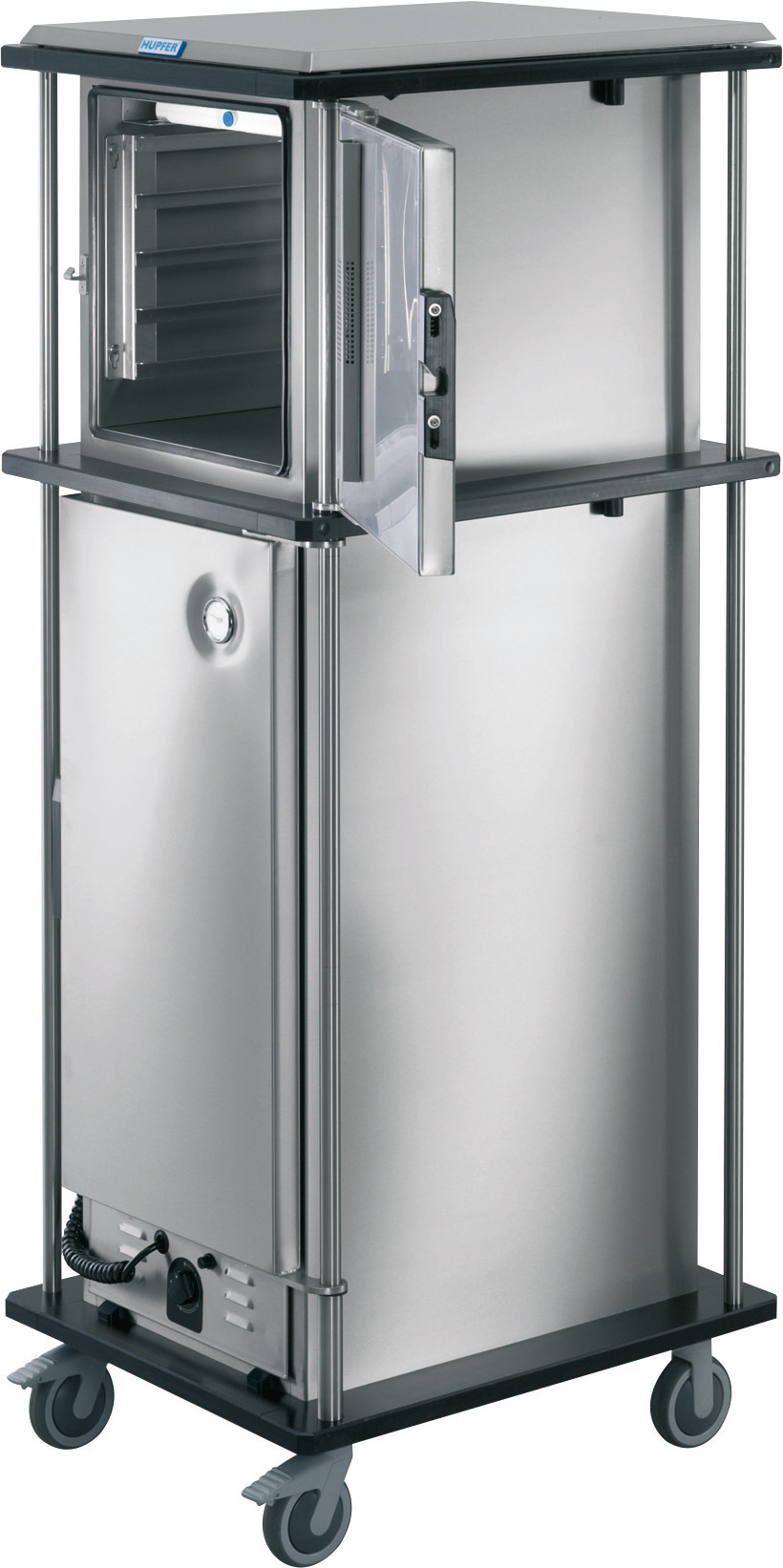 Hupfer Bankettwagen Umluft beheizt / passivBKW 1/14 L-GN-57,5 + 5 PK Das Multitalent für die Speisenlogistik – der Köhler Bankettwagen von Hupfer › Anwendungsbereiche: Bankett / Veranstaltungen, Altenheim, Catering, Außer-Haus-Verpflegung› hygienisch einwandfrei, leichte Reinigung› mit 2 Fächern› für max. 14 x GN 1/1 + 5 x GN 1/1 Behälter oder Rost› Höhenraster: 57,50 mm unten / 72 mm oben› mit Längseinschub (530 x 325 mm)› Temperaturbereich: +30°C bis +95°C› Nutzlast: 95,00 kg› 2 Bock-, 2 Lenkrollen mit Feststeller ø 125 mm› Hauptbauweise: geschlossen, doppelwandig, einteilig