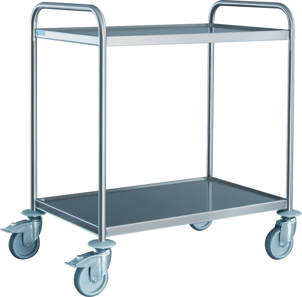 Hupfer ServierwagenSW 10x6/2 › Material: Edelstahl› Belastung pro Bord: 40,00 kg› Gesamt-Tragkraft: 80,00 kg› Borde verschweißt› Nutzhöhe zwischen den Borden 591 mm› Höhe oberstes Bord 850 mm› 4 Lenkrollen ø 125 mm, stahlverzinkt / davon 2 mit Totalfeststellern