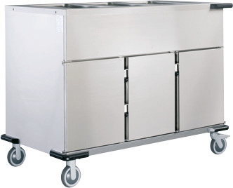 Hupfer Speisentransportwagen SPTW 3EBH 3WF › Schrankinnenmaß: 328 x 560 x 438 mm› Kapazität: 3 x GN 1/1 - 200 mm tief / 15 x GN 1/1 - 65 mm tief› Rastermaß: 75 mm › Längseinschub› 3 Becken / 3 Wärmeschränke› Temperaturbereich: Becken +30°C bis +95°C / Fächer +30°C bis +80°C › Gesamt-Traglast: 140,00 kg› 4 Lenkrollen ø 125 mm, davon 2 mit Feststeller› Bauweise: geschlossen, doppelwandig, dreiteilig