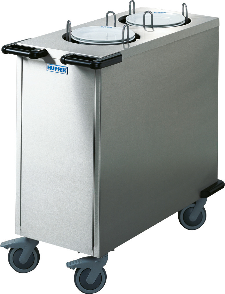 Hupfer Tellerstapler unbeheiztTE 2x19-26/V › für Teller ø 190 bis 260 mm› mit 2 Stapelschächten› Kapazität max. ohne Haube: 144 Teller› Kapazität max. mit Haube: 166 Teller› Stapelhöhe 670 mm› Gesamt-Tragkraft: 140,00 kg› 4 Lenkrollen ø 125 mm, davon 2 mit Totalfeststellern › Bauweise: geschlossen, einwandig