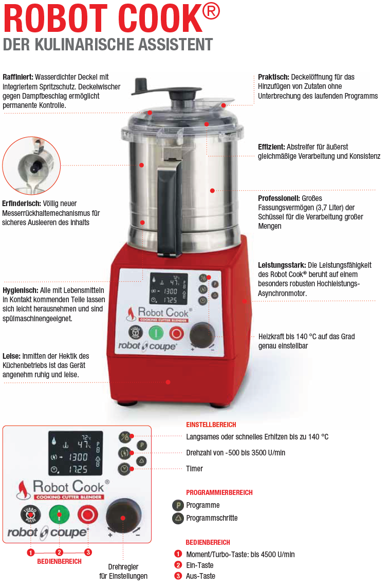 Robot-Coupe Kochender Kutter-MixerRobot Cook Der Robot Cook regt die Fantasie der Küchenchefs an und ist die erste professionelle, kochende Küchenmaschine. Er ist der ideale Helfer bei der Erfindung und Verwirklichung warmer und kalter, herzhafter und süßer Gerichte. Der Robot Cook vereint Technologie mit Innovation und ist somit die ideale Lösung für die optimale Nutzung der Zeit, bei der Zubereitung der Gerichte. Mit ihm lässt sich perfekt emulgieren, zermahlen, pürieren, hacken, vermischen und kneten.
