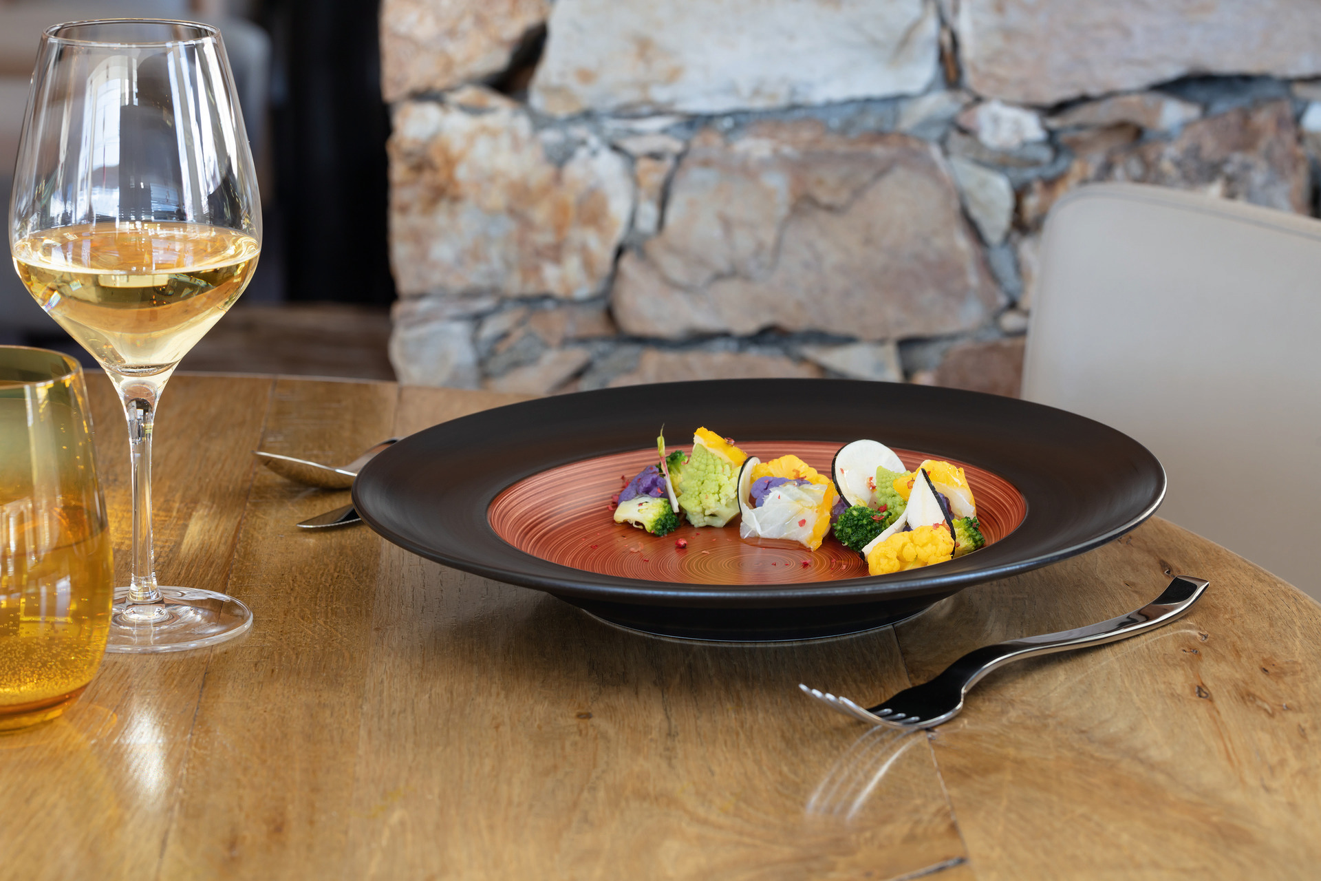 RAK Trinidad Eingerahmt von einer äußerst eleganten schwarzen Engobe offenbart TRINIDAD drei Farbvariationen mit einem Dekor, das mit dem Pinsel aufgetragen wurde. Diese Serie bietet ein vollständiges Set an Formen und Größen für jeden Verwendungszweck in der Gastronomie.