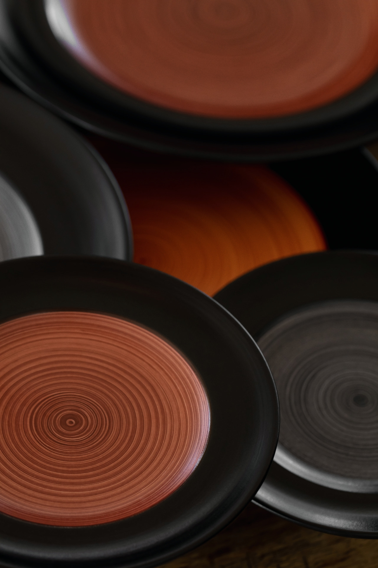 RAK Trinidad Eingerahmt von einer äußerst eleganten schwarzen Engobe offenbart TRINIDAD drei Farbvariationen mit einem Dekor, das mit dem Pinsel aufgetragen wurde. Diese Serie bietet ein vollständiges Set an Formen und Größen für jeden Verwendungszweck in der Gastronomie.