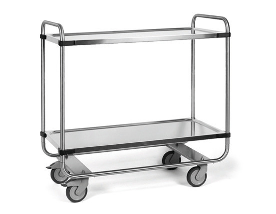 Rieber Servierwagen servo+ SW-1060 RS-2M Besondere Merkmale: › Schraubkonstruktion (montiert)› schwere Ausführung› eingeschweißte Traversen für Rollenbefestigung› schallgedämmt› tiefgezogene Borde mit Stopprand› Stoßecken an jedem Bord Ausstattung: › rostfreie Rollenausstattung mit 4 Lenkrollen ø 125 mm, 2 davon feststellbar› Lichtmaß zwischen den Borden: 585 mm› Rundrohr-Schiebebügel› max. Flächenbelastung pro Bord: 80 kg› Leergewicht: 20 kg Material: › Edelstahl rostfrei
